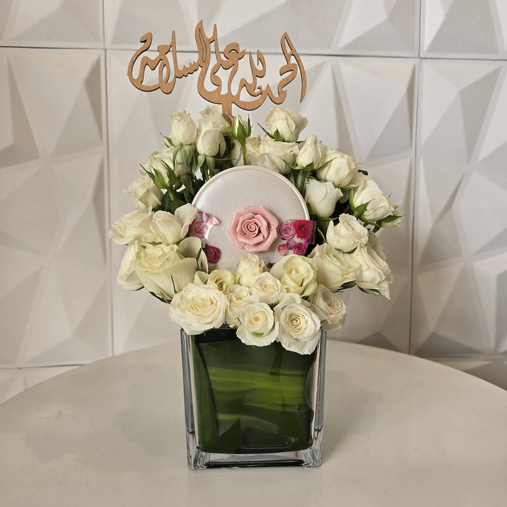 فازة من ورد البيبي جوري مع شوكولاتة من ماركة بستاني.