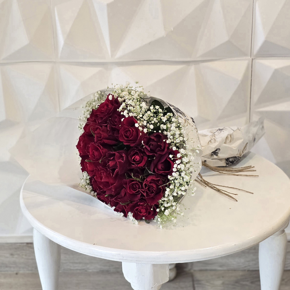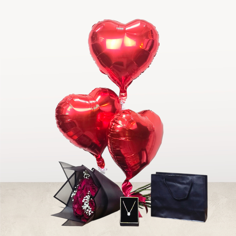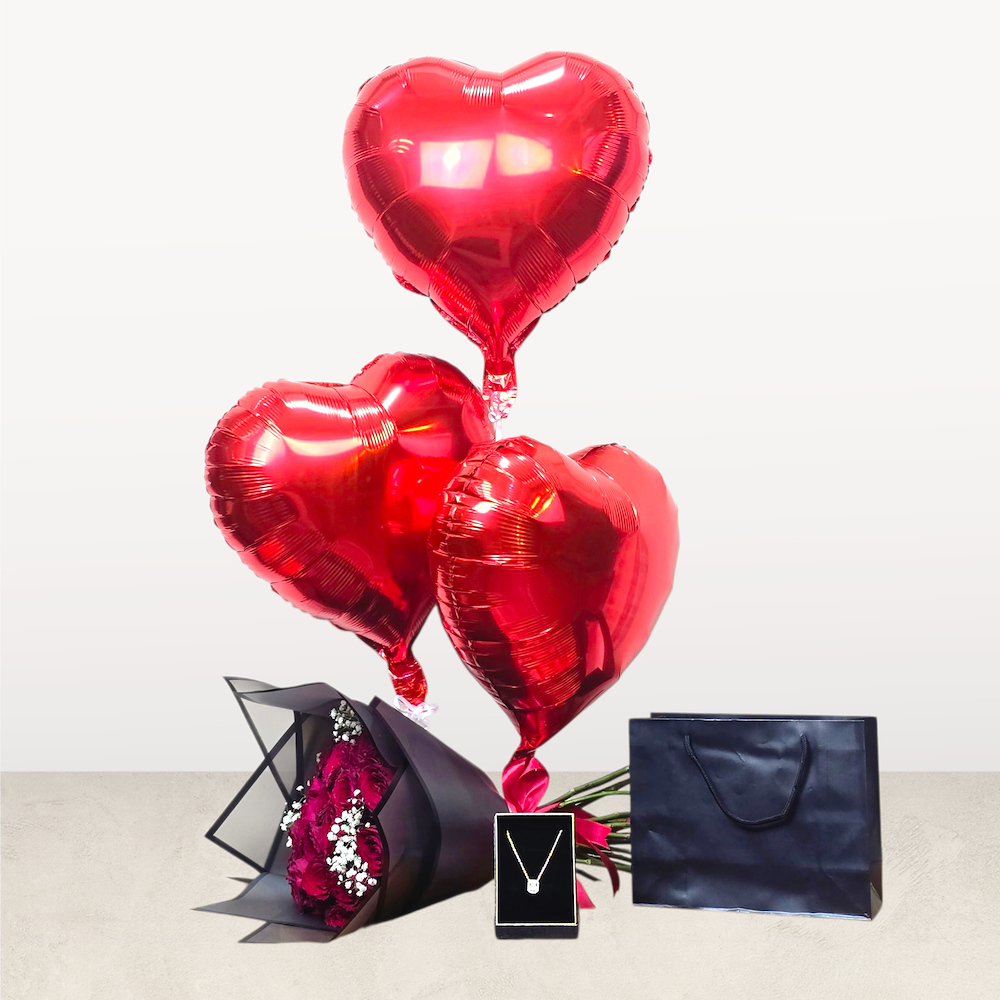 باقة تحتوي على الجوري والجيبسوفيلا مع البالونات وسلاسل زركون.