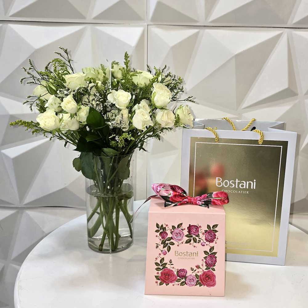 باقة تحتوي على زهور البيبي جوري البيضاء، مرتبة بشكل جميل في فازة. تأتي مع علبة شوكولاتة من بستاني.