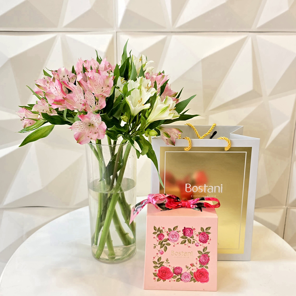 فازة تحتوي على زهور الألستروميريا الوردية والبيضاء مع الشوكولاتة من بستاني.