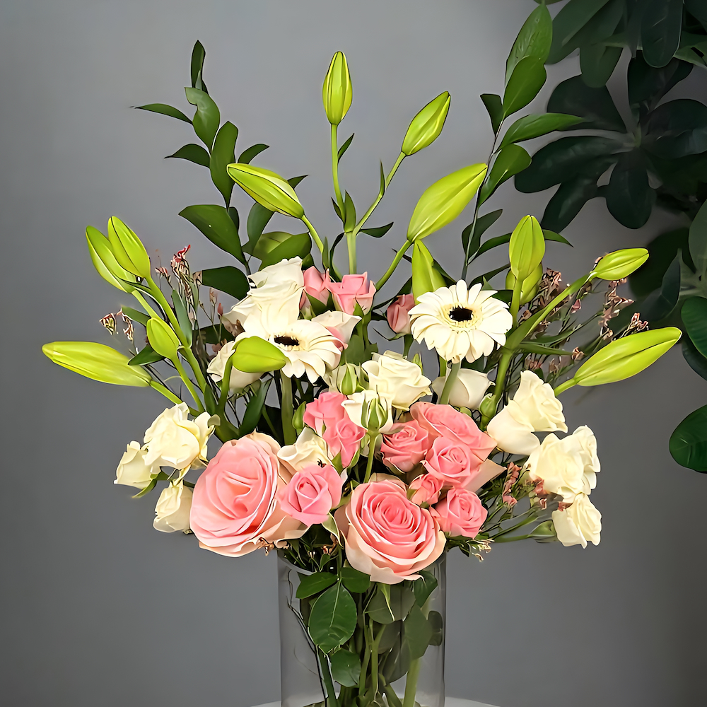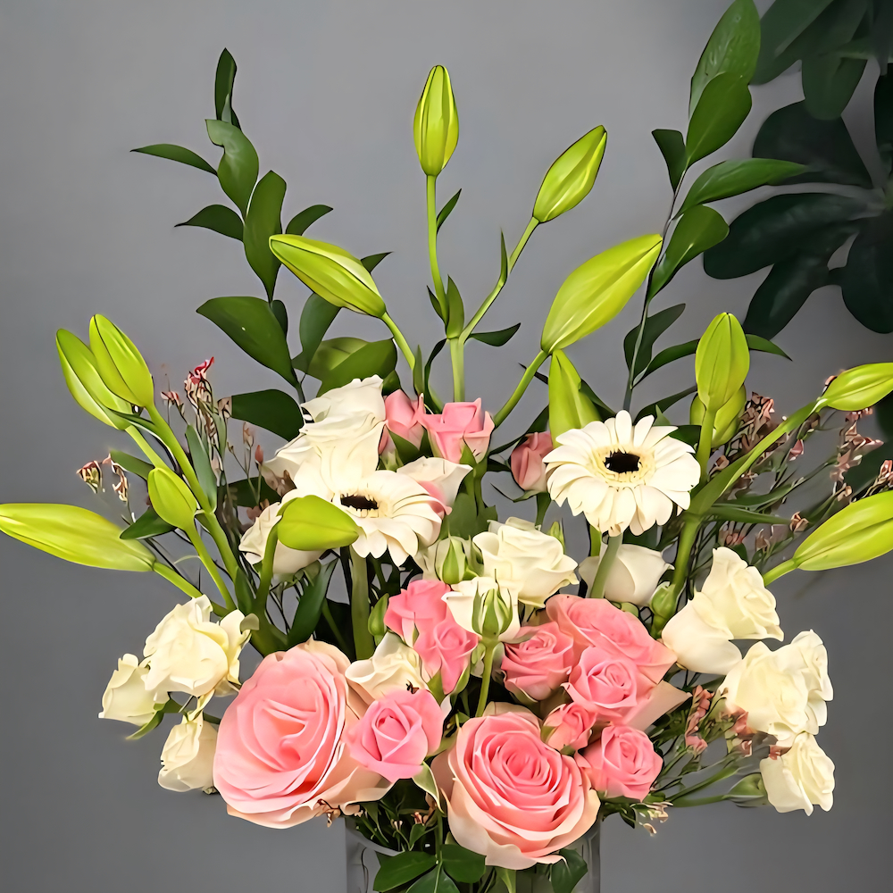 فازة تحتوي على الجوري، البيبي جوري، الجيربيرا والليليز.