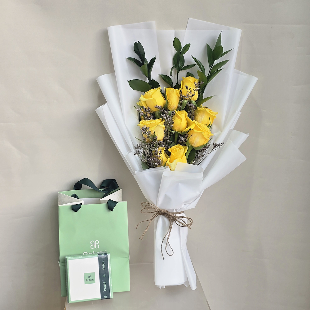 باقة أنيقة مليئة بأزهار الجوري الصفراء مع 9 قطع شوكولاتة باتشي.