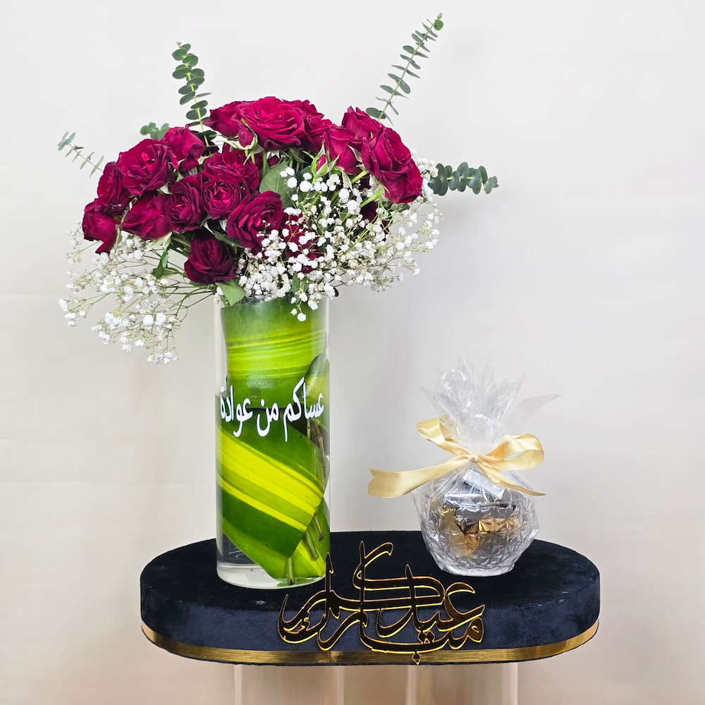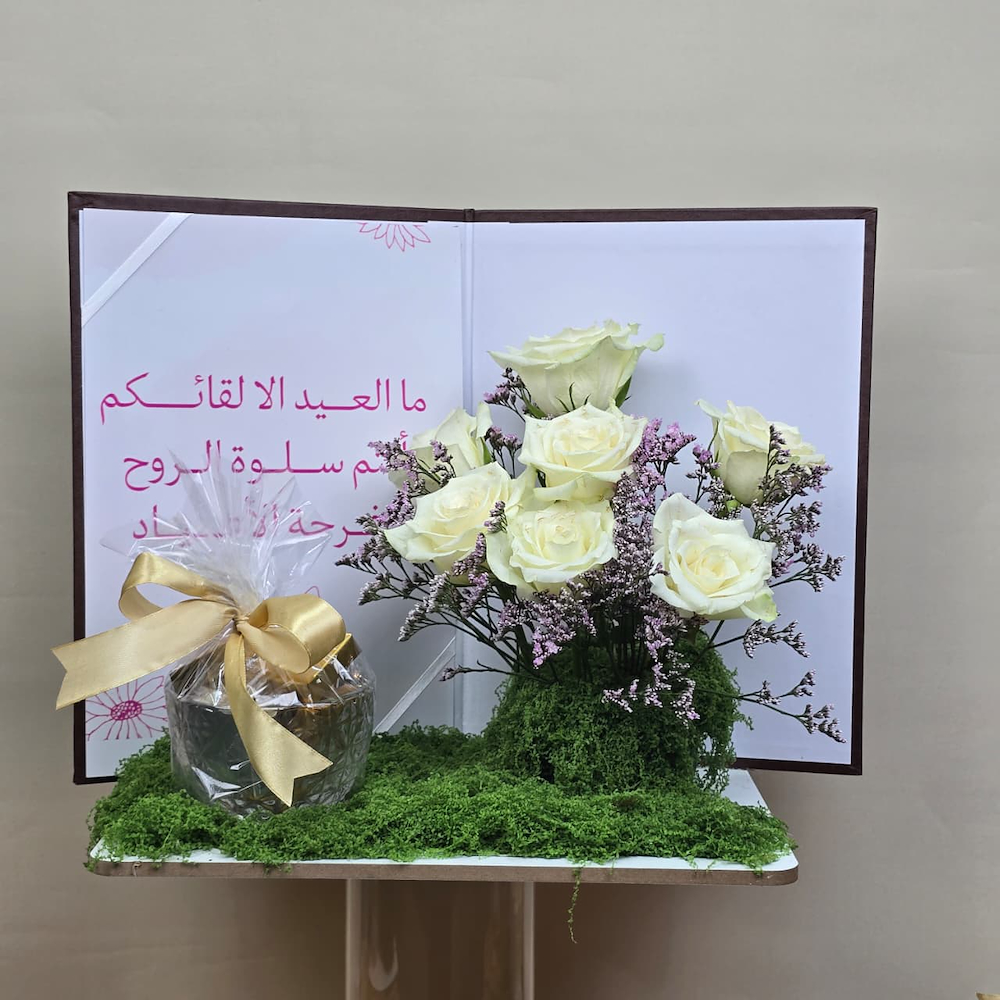 ستاند خشبي مع كتاب العيد من الجلد، أزهار الجوري والشوكولاتة البلجيكية الفاخرة.