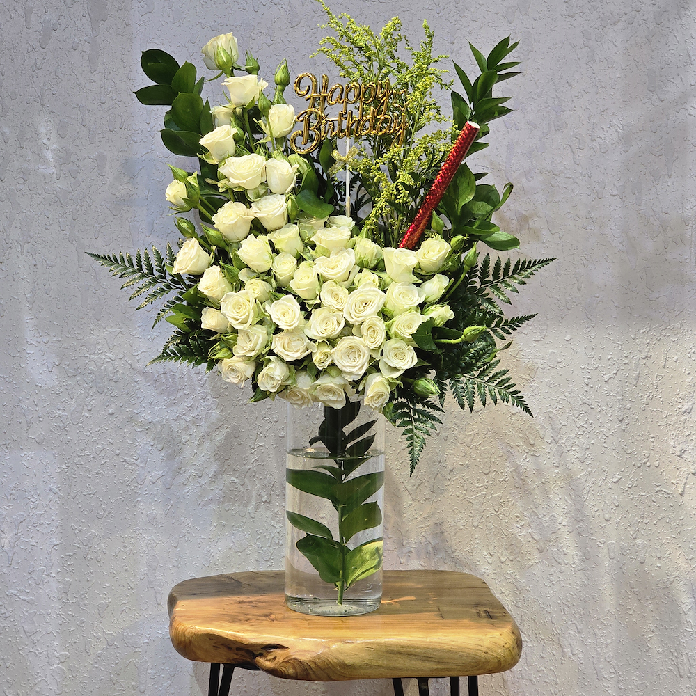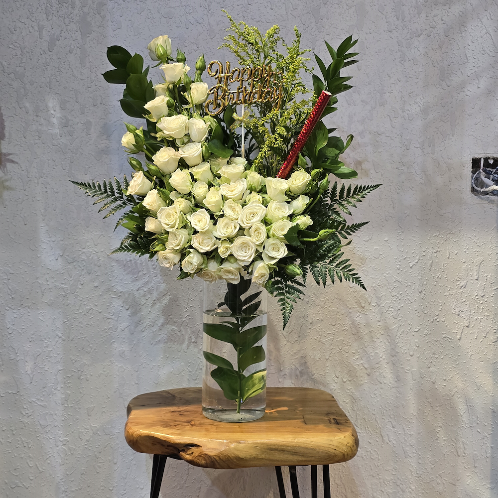 فازة من البيبي جوري الابيض مع تغريسة عيد الميلاد.
