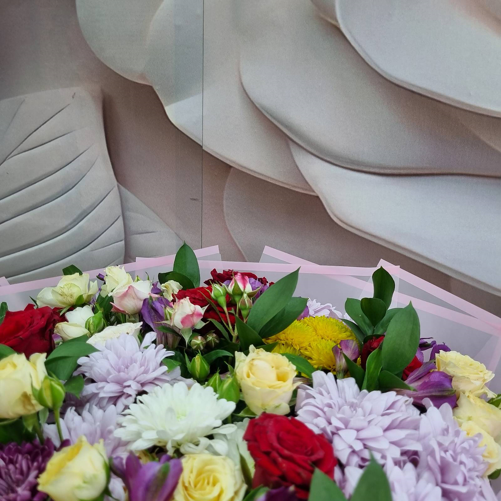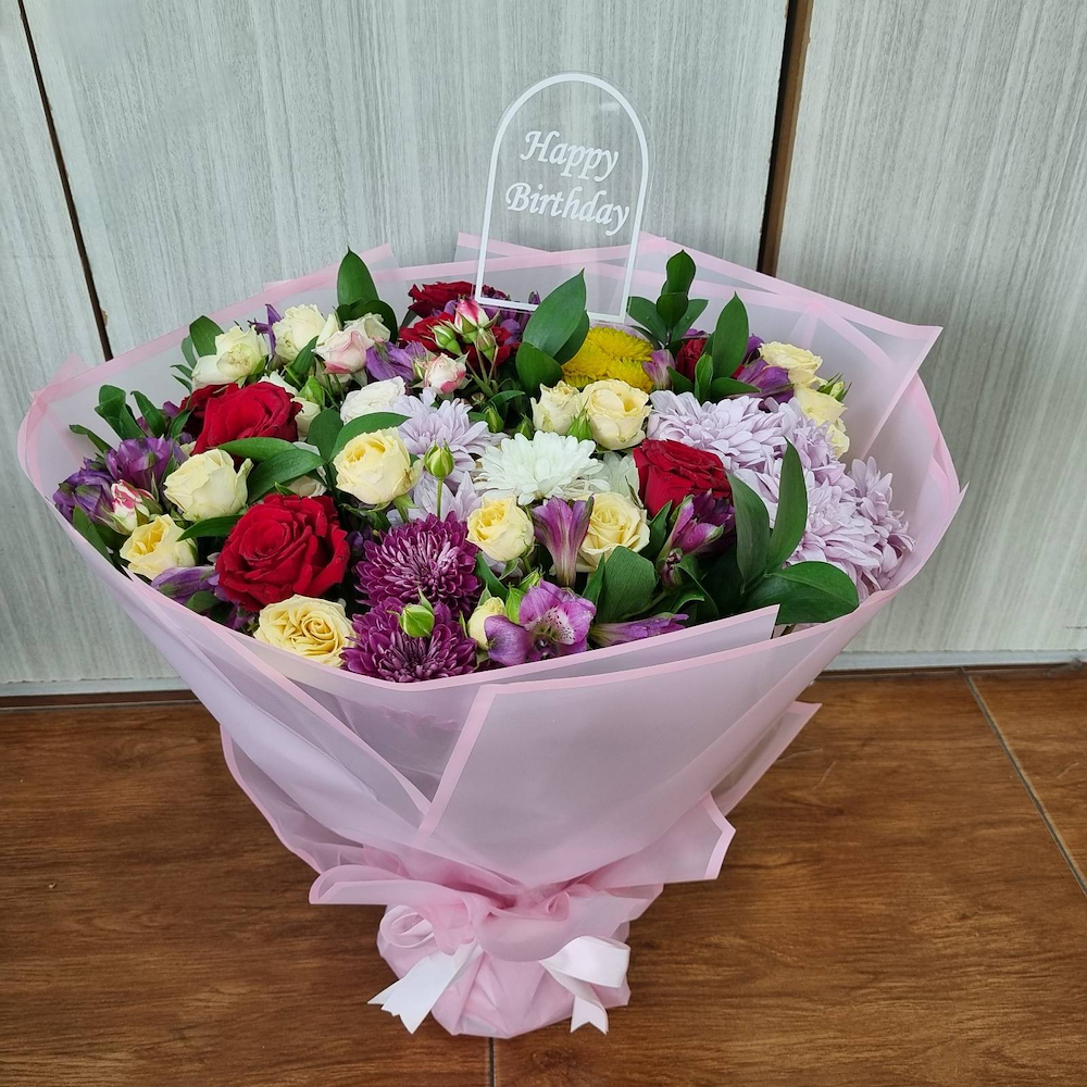 باقة يد تحتوي على زهور الجوري، البيبي جوري، الليلي والألستروميريا، مرتبة بشكل جميل.