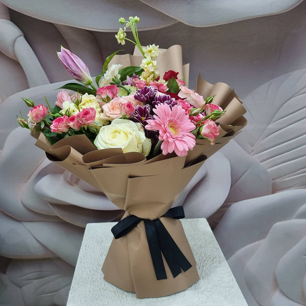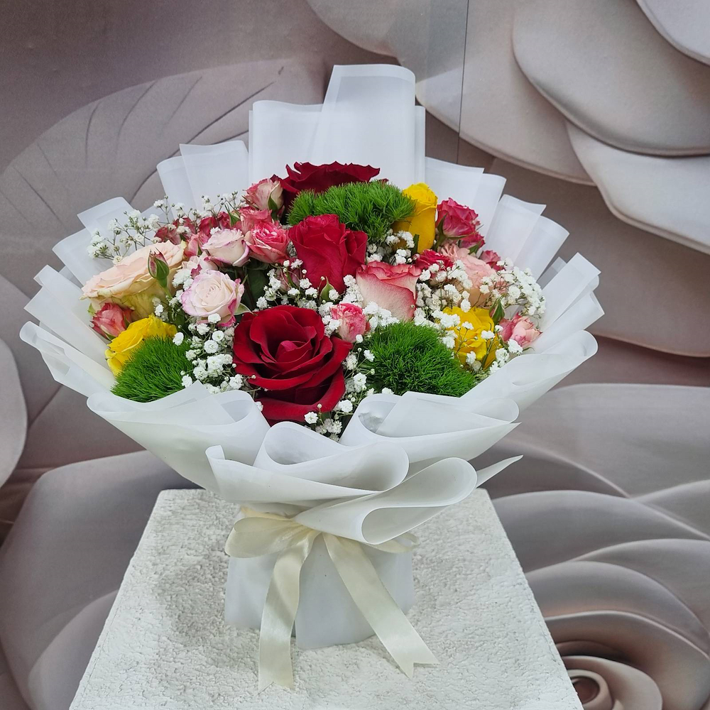 باقة يد تحتوي على زهور الجوري، الجبسوفيلا والأوراق الجلدية، مرتبة بشكل جميل.