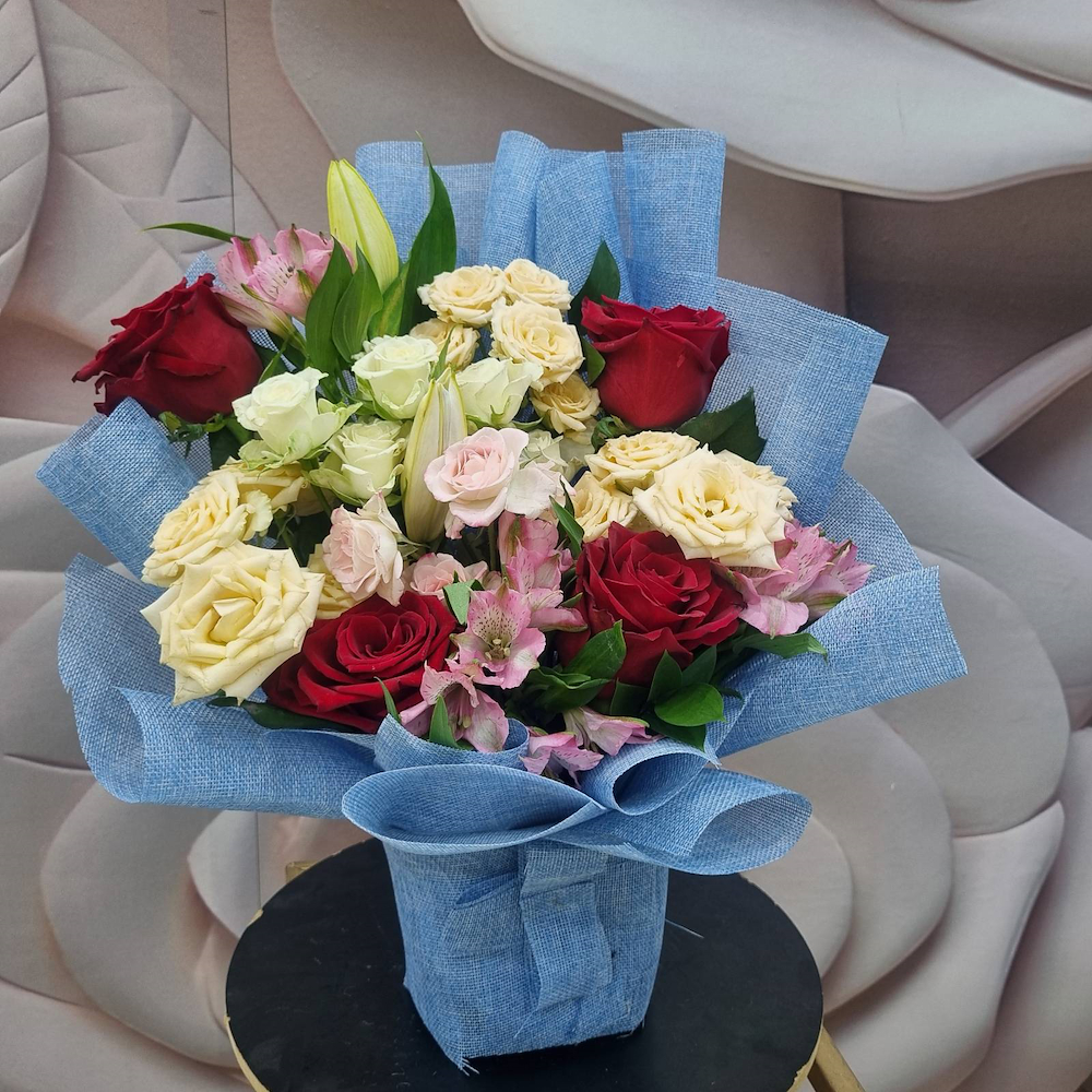 باقة يد تحتوي على زهور الجوري، البيبي جوري، الليلي والألستروميريا، مرتبة بشكل جميل.