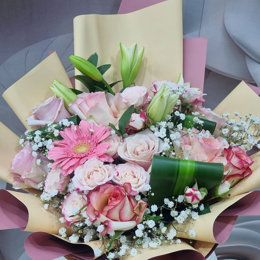 باقة يد تحتوي على زهور الجوري، البيبي جوري، الليلي، الجيربيرا والجبسوفيلا، مرتبة بشكل جميل.