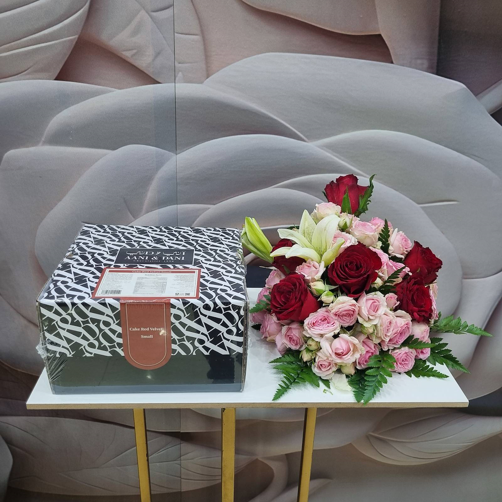 تحتوي الباقة على زهور الجوري، البيبي جوري والليلي، مرتبة بشكل جميل في صينية مع كيكة من آني وداني.