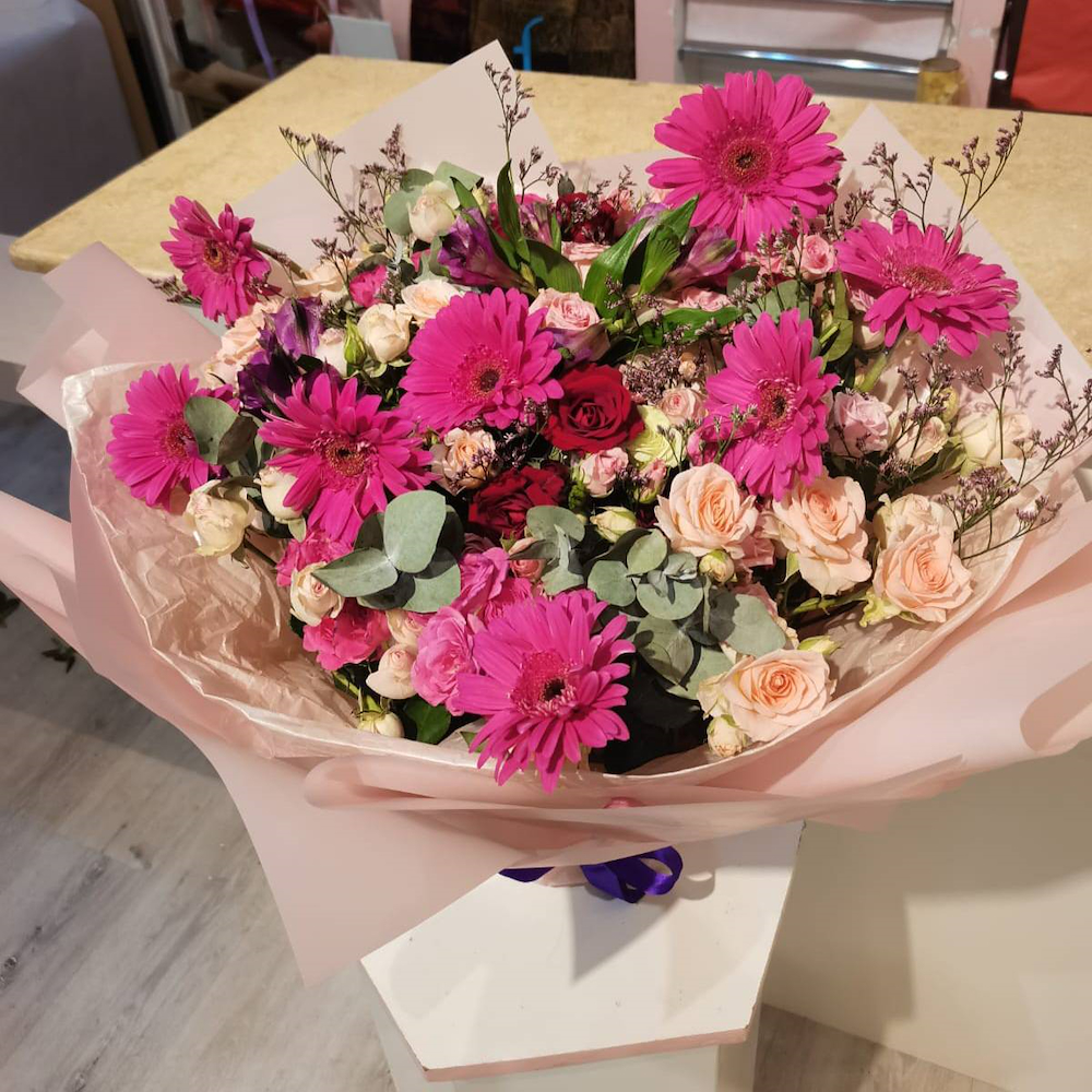 باقة مليئة بأزهار البيبي روز والجربيرا.
