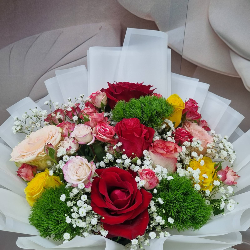 باقة يد تحتوي على زهور الجوري، البيبي جوري والجبسوفيلا، مرتبة بشكل جميل.