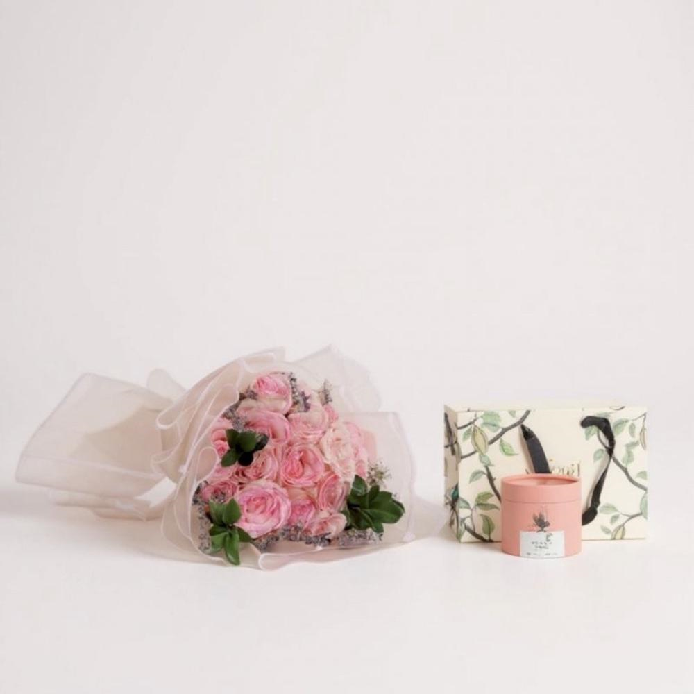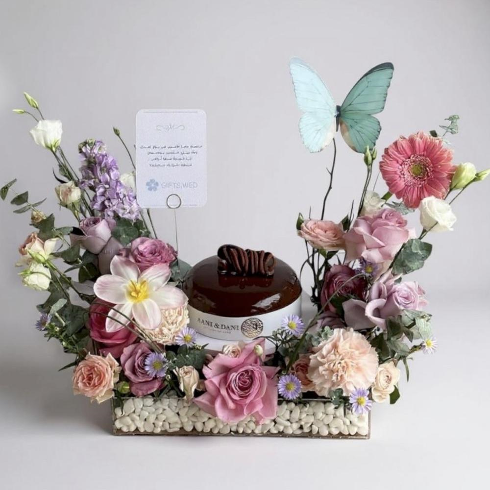 باقة فاخرة تتميز بأزهار الجوري، البيبي روز، الكارنيشن والجربيرا مع فراشة وكيكة مميزة من آني وداني.