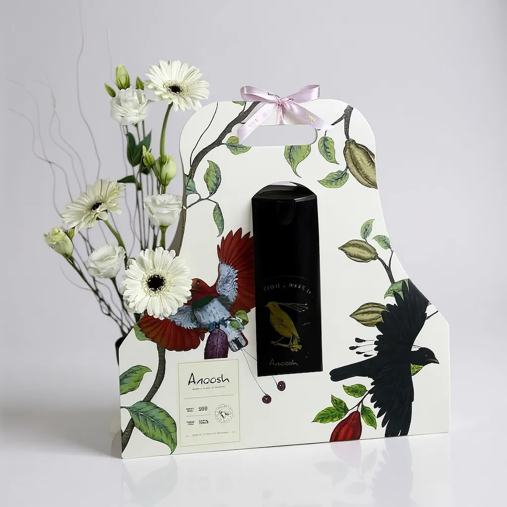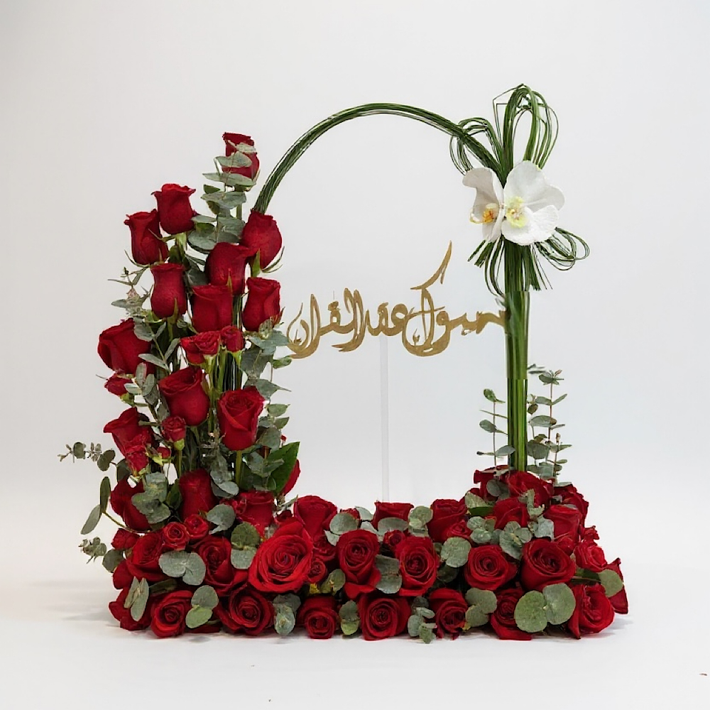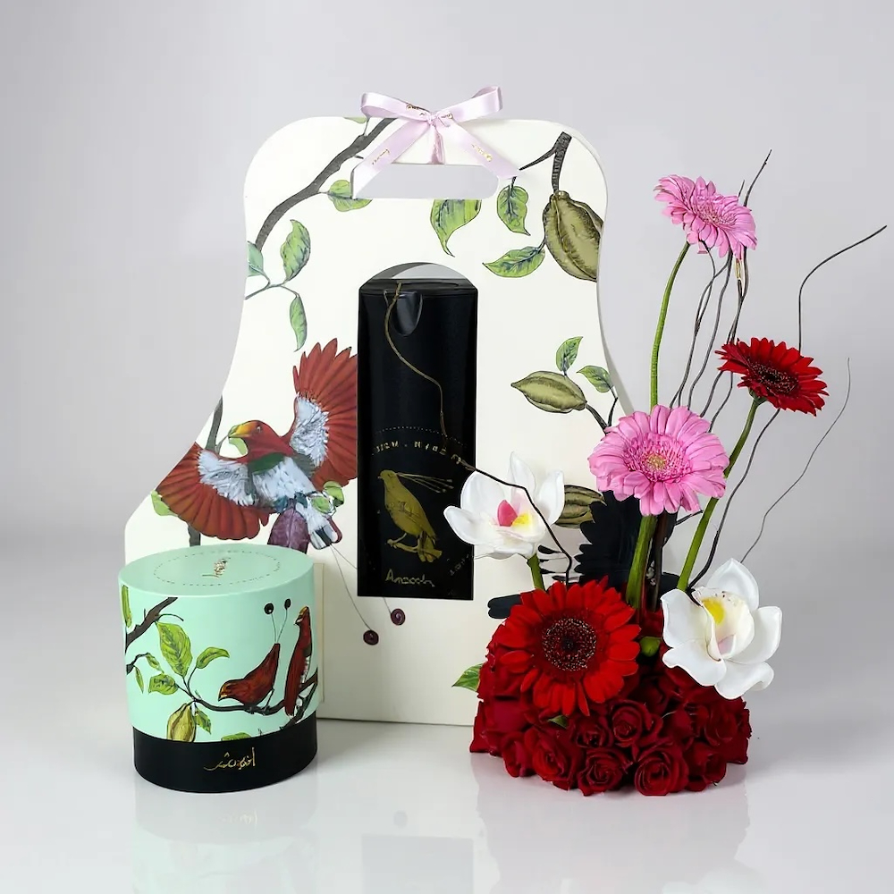 صندوق قهوة عربية من انوش وصندوق يحتوي على 8 قطع كوكيز مع تنسيق زهور بشكل انيق.