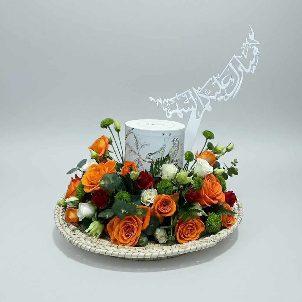 صينية أنيقة مليئة بأزهار الجوري باللون الأبيض والأصفر مع تغريسة وشوكولاتة باتشي.