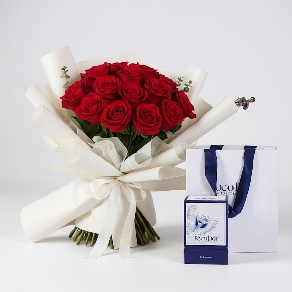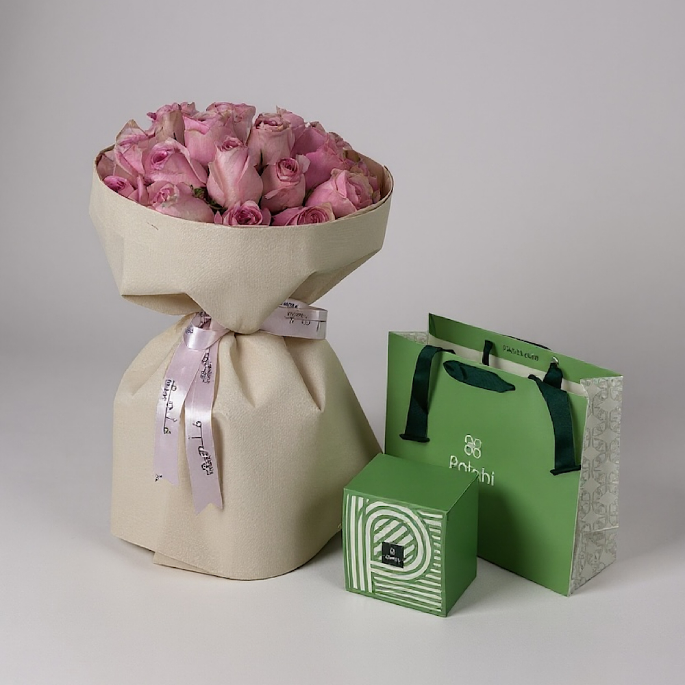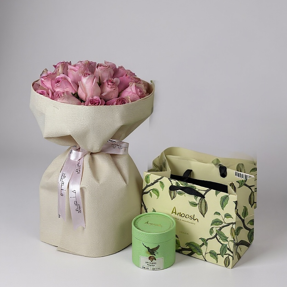 صندوق يحتوي على الجوري، البيبي جوري، الجيربيرا، التوليب واليوكالبتوس مع شوكولاتة انوش.