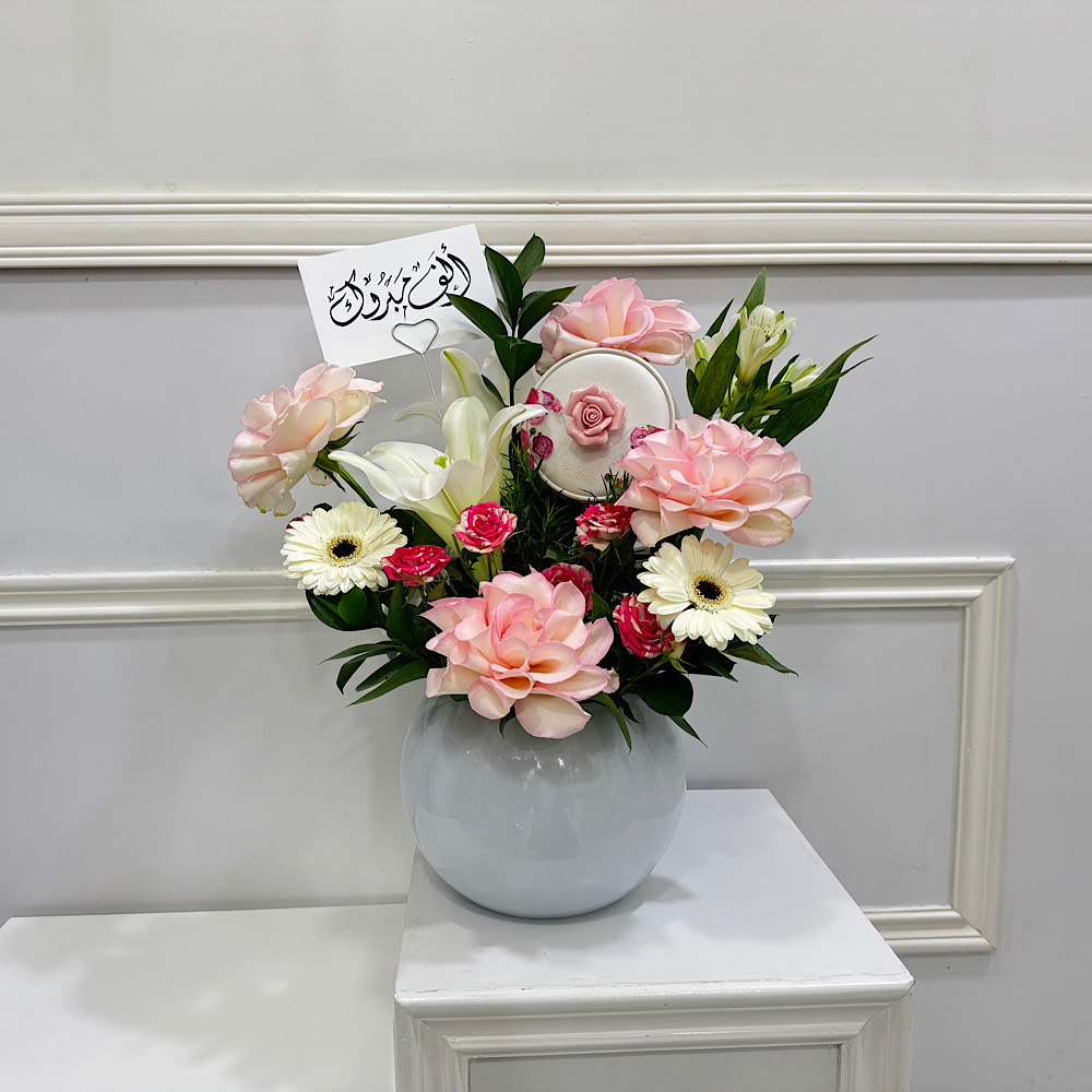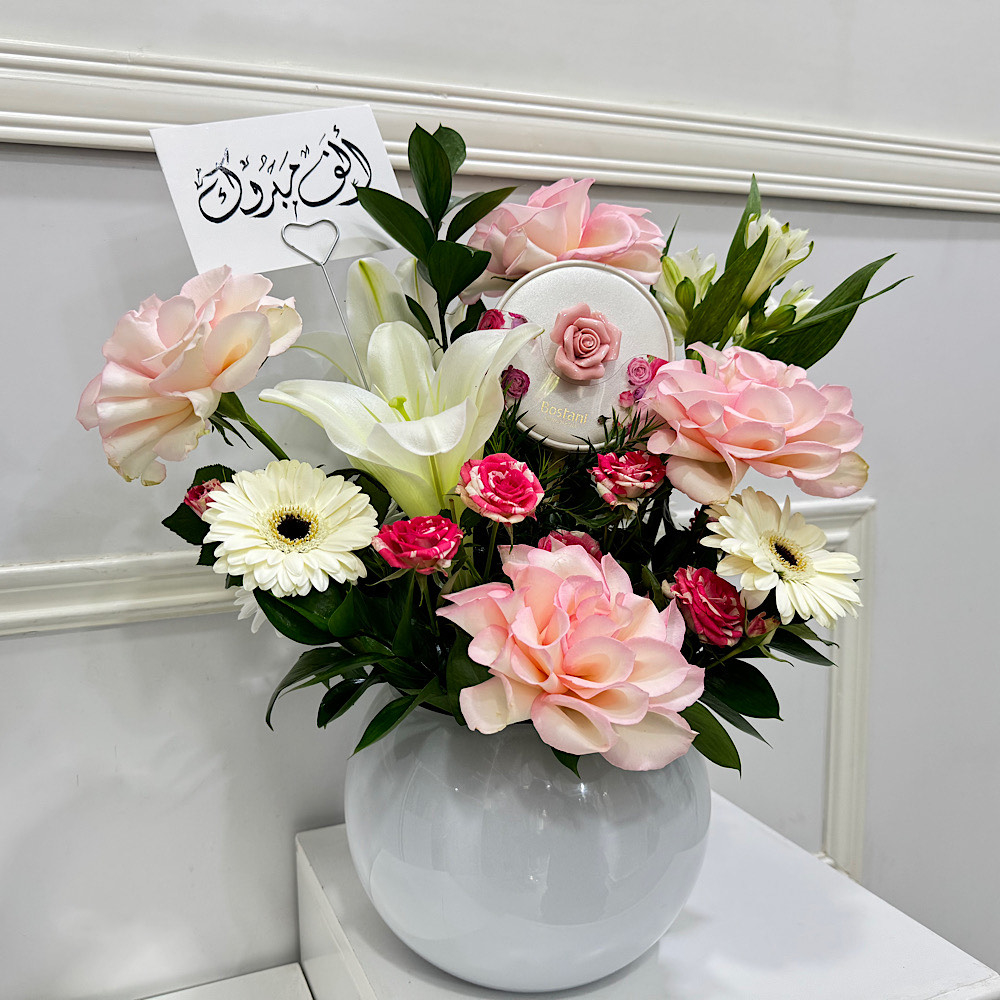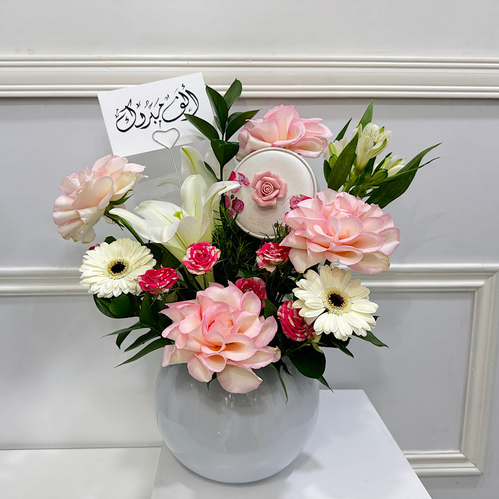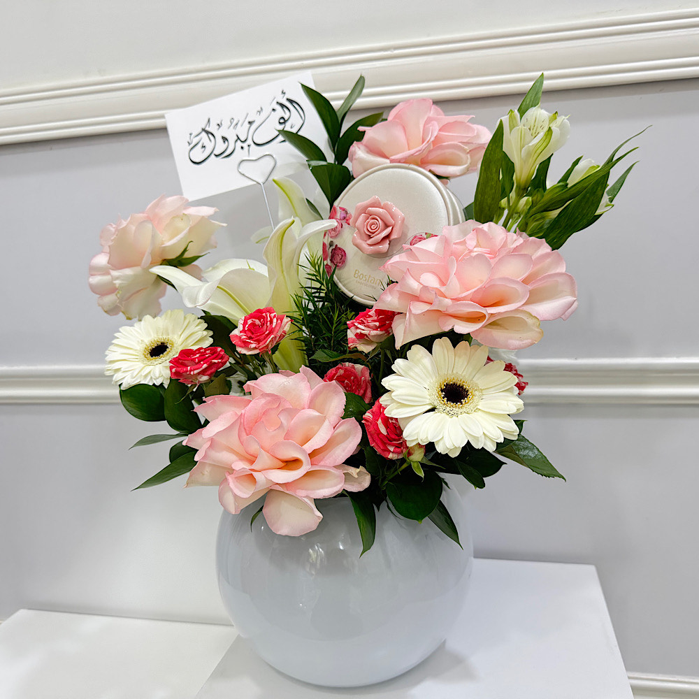 فازة تحتوي على الجوري، الجيربيرا، الليليز والالستروميريا مع شوكولاتة بستاني.