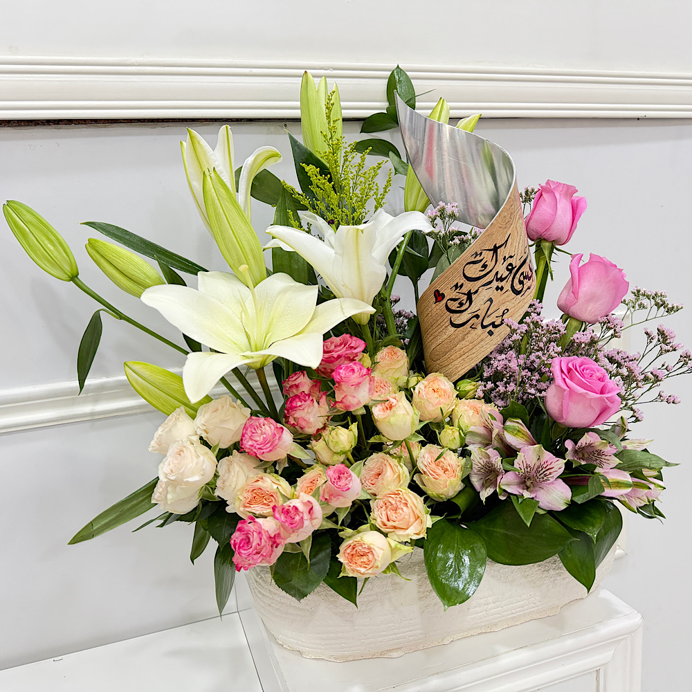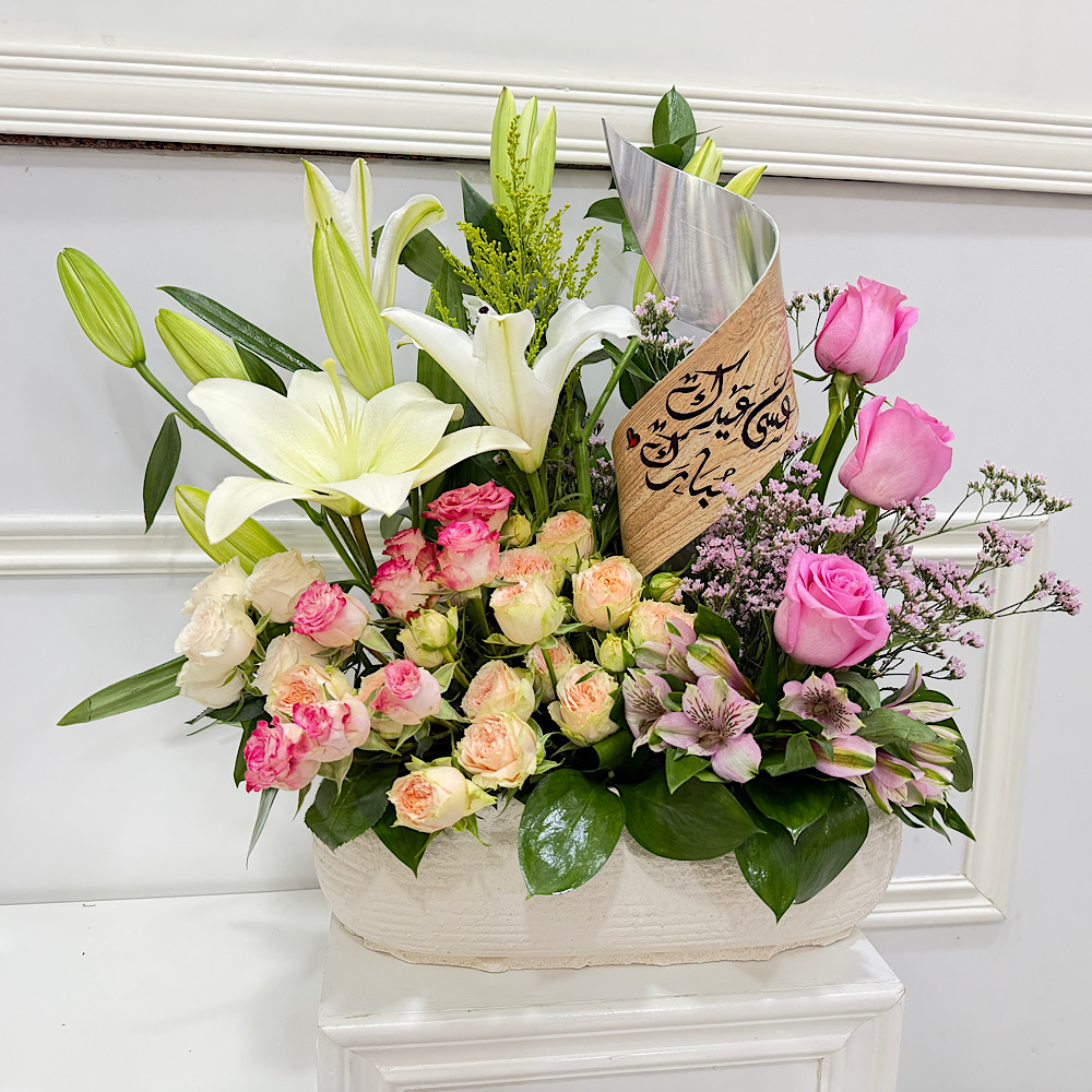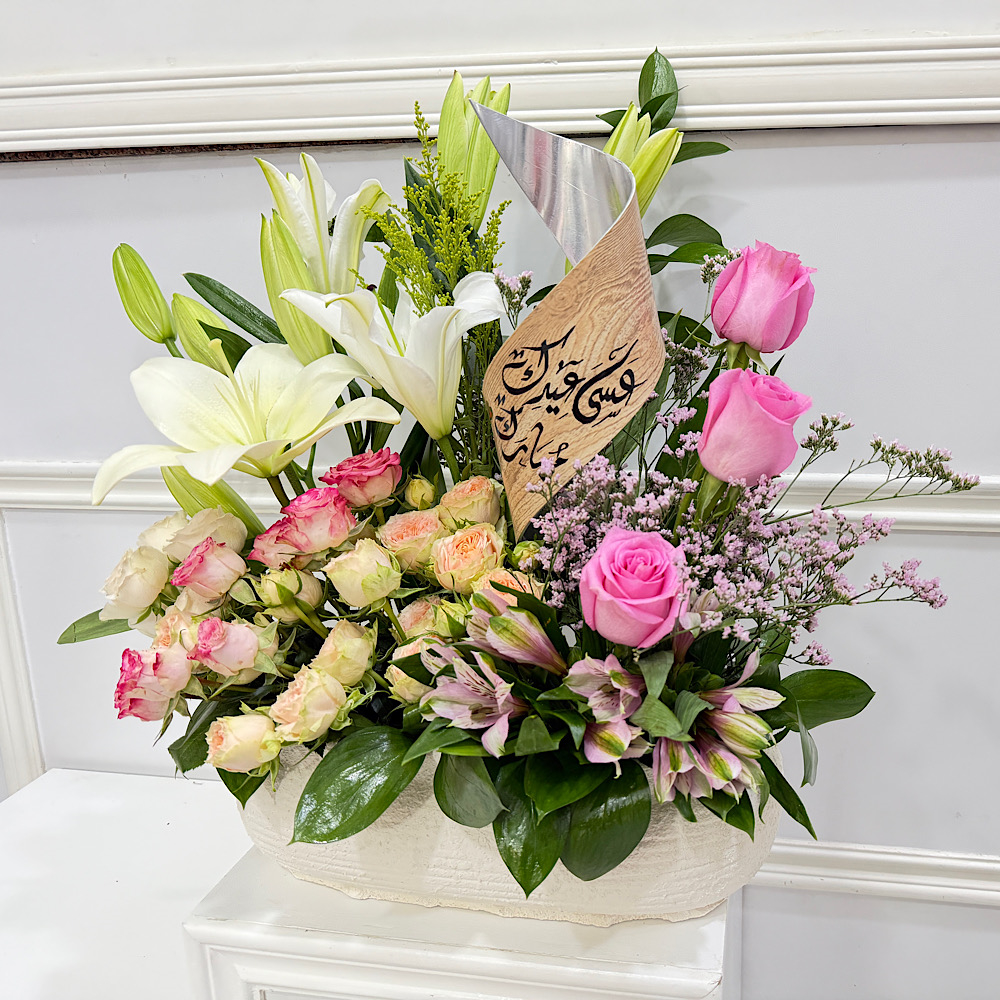 قاعدة أنيقة من الجبس مزينة بزهور الجوري، البيبي جوري، الليلي والألستروميريا، مع ستاند يحمل عبارة معايدة بالعيد. هدية بسيطة وجميلة تضيف لمسة دافئة للمكان وتبقى ذكرى لطيفة من العيد.