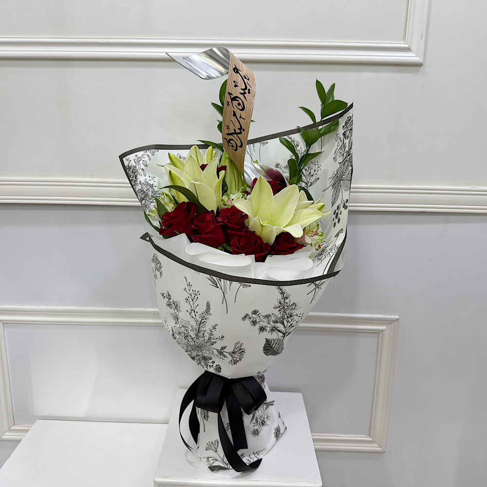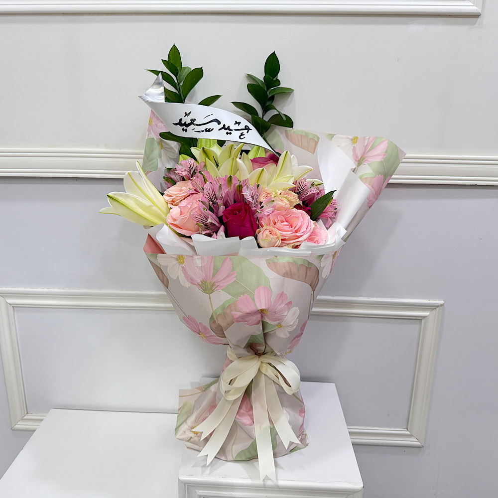 زهور الجوري، الليلي والألستروميريا مرتبة بشكل جميل في باقة يد.