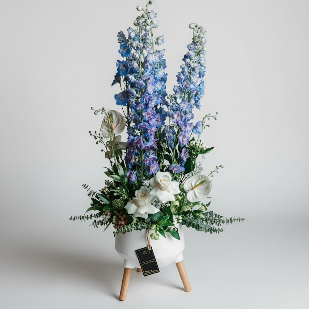 ستاند يحتوي على الجوري، الانثوريوم والدلفينيوم.