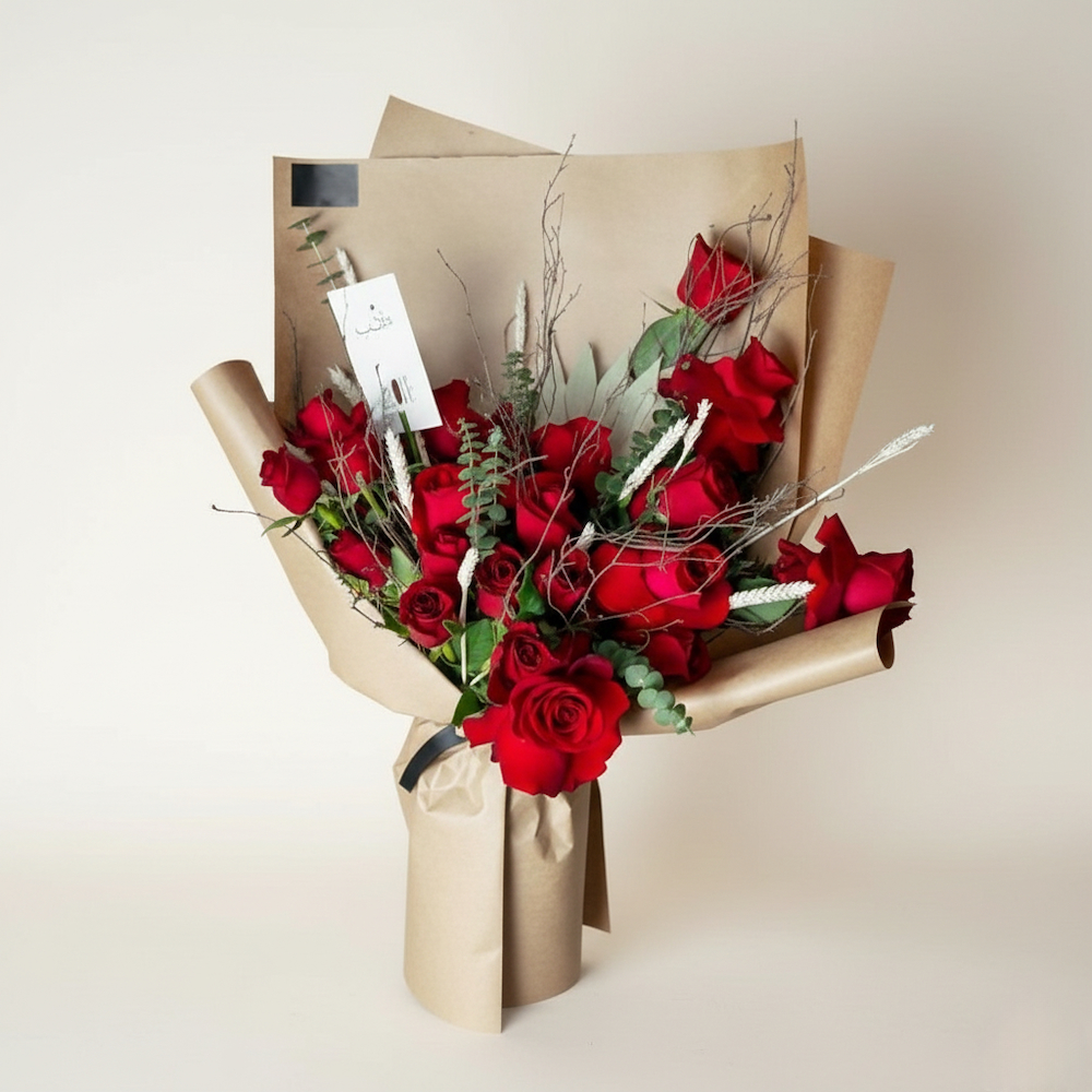باقة تحتوي على الجوري الحمراء واليوكالبتوس.