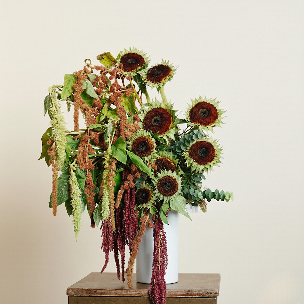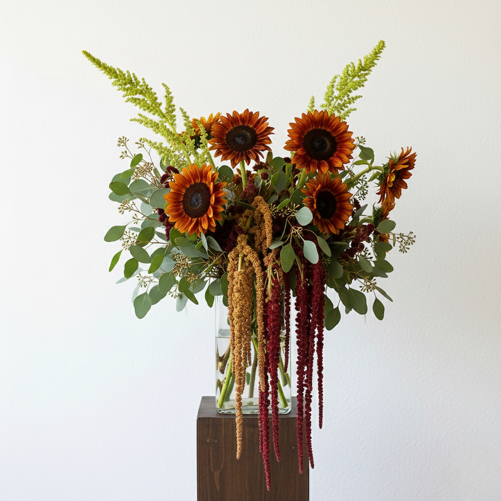 فازة أنيقة بأزهار الجوري الهندي والأمارنثوس وعباد الشمس.