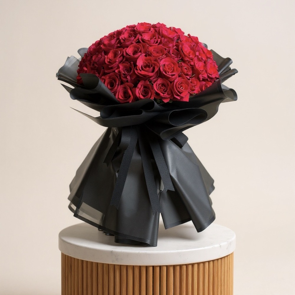 باقة أنيقة تحتوي على 50 زهرة من أزهار الروز باللون الأحمر، مثالية لذكرى الزواج والخطوبة، أو كهدية لا تنسى.