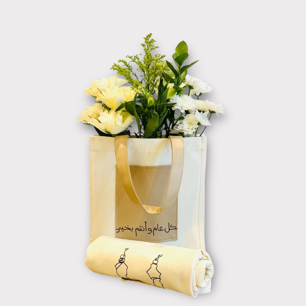 حقيبة تحتوي على زهور الجوري، الألستروميريا والكريز مع سجادة الصلاة.