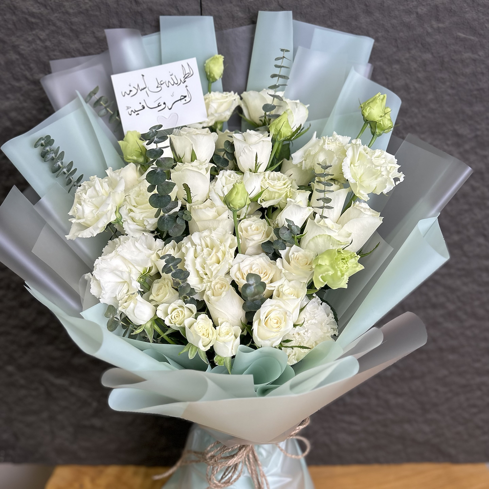 باقة تحتوي على الجوري، البيبي جوري، الكارنيشن واليوكالبتوس.