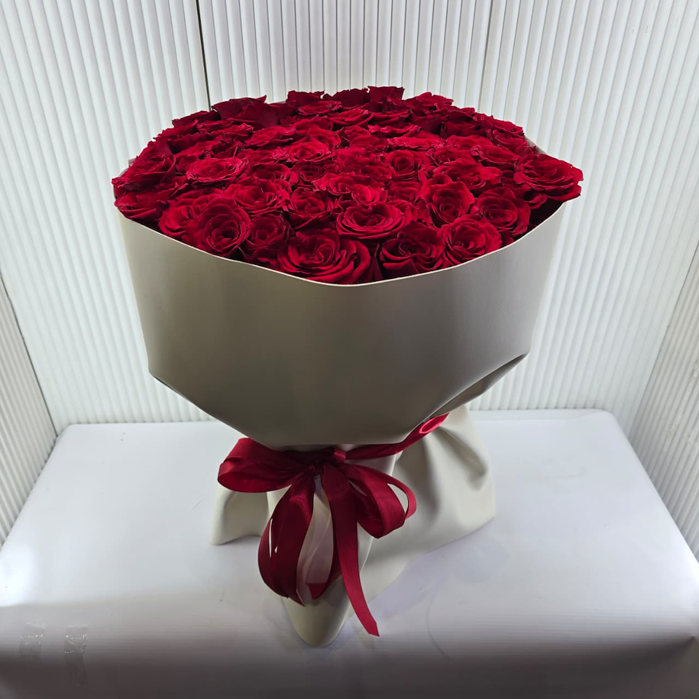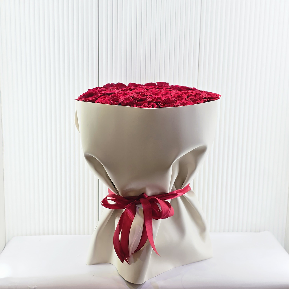 باقة فاخرة تحتوي على 100 زهرة من الجوري باللون الأحمر مع تغليف مميز من الجلد.