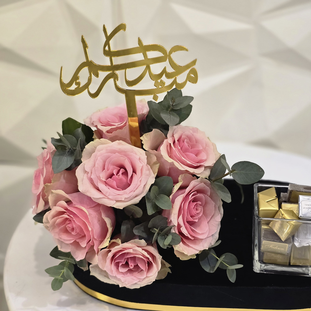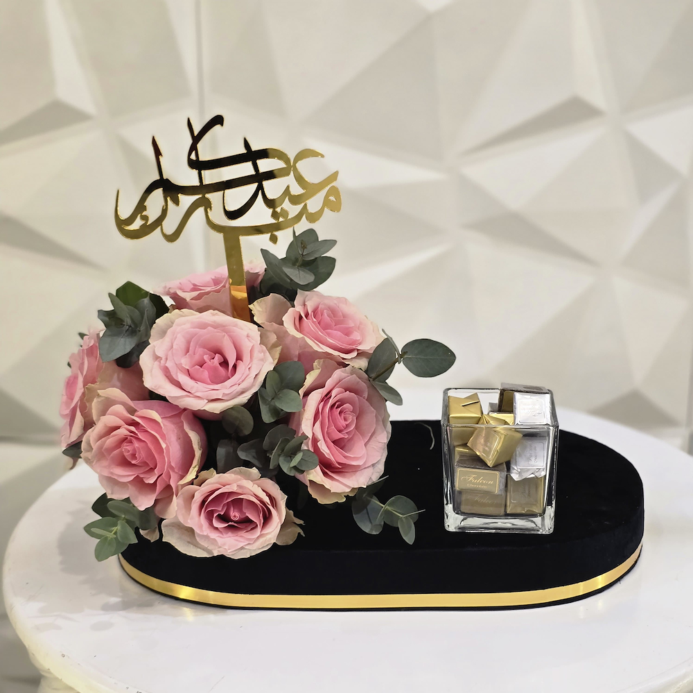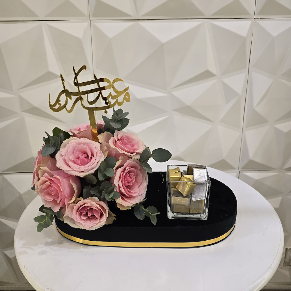 صينية تحتوي على أزهار الجوري العطرية مع الشوكولاتة.
