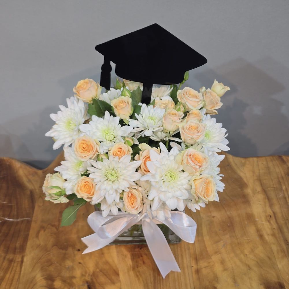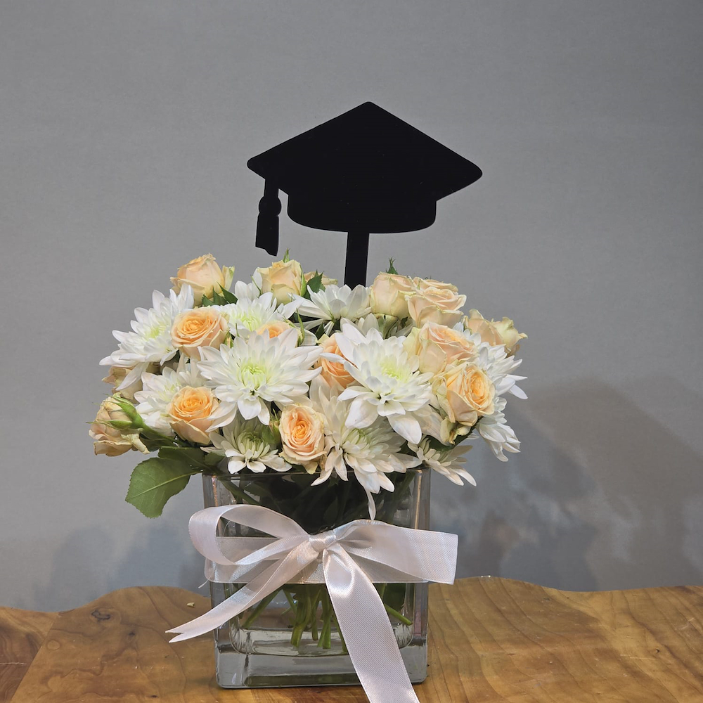 فازة تحتوي على الجوري وزهور الكريز مع قبعة التخرج.