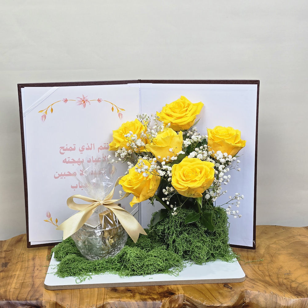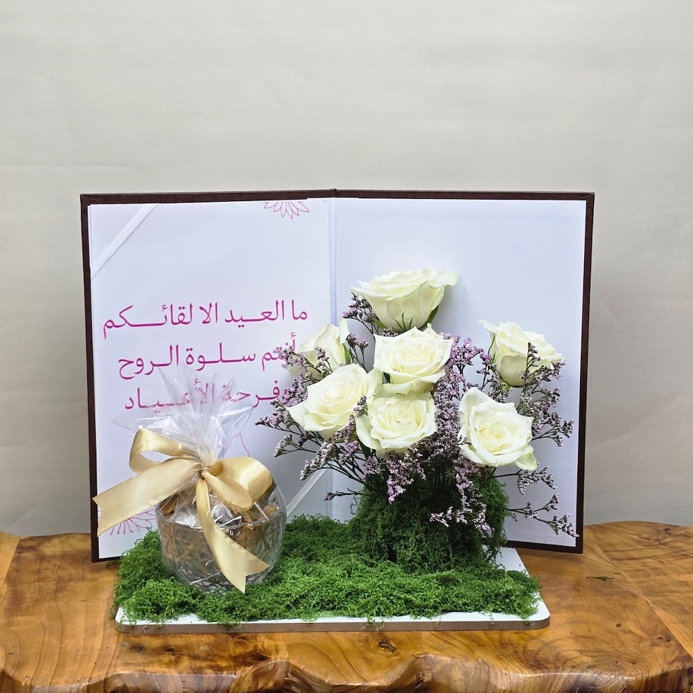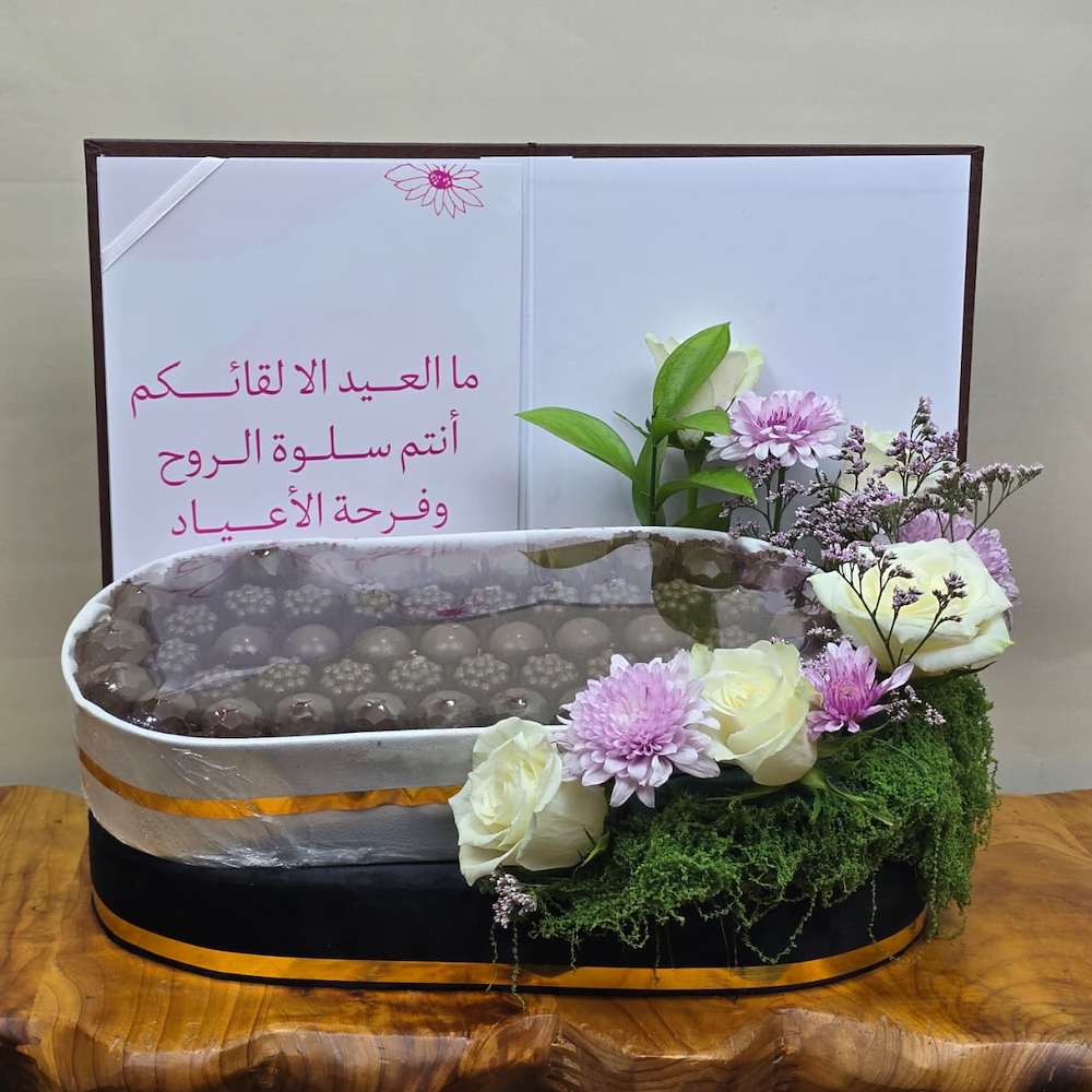 صينيه خشبية تحتوي على زهور الجوري مع شوكولاتة بستاني صغير.
