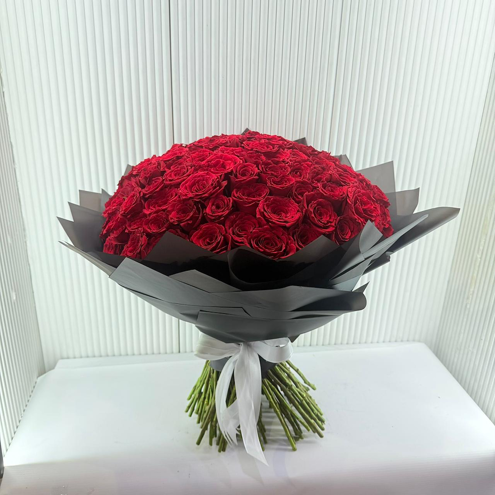 باقة يد تحتوي على 150 زهرة جوري، مرتبة بشكل جميل.