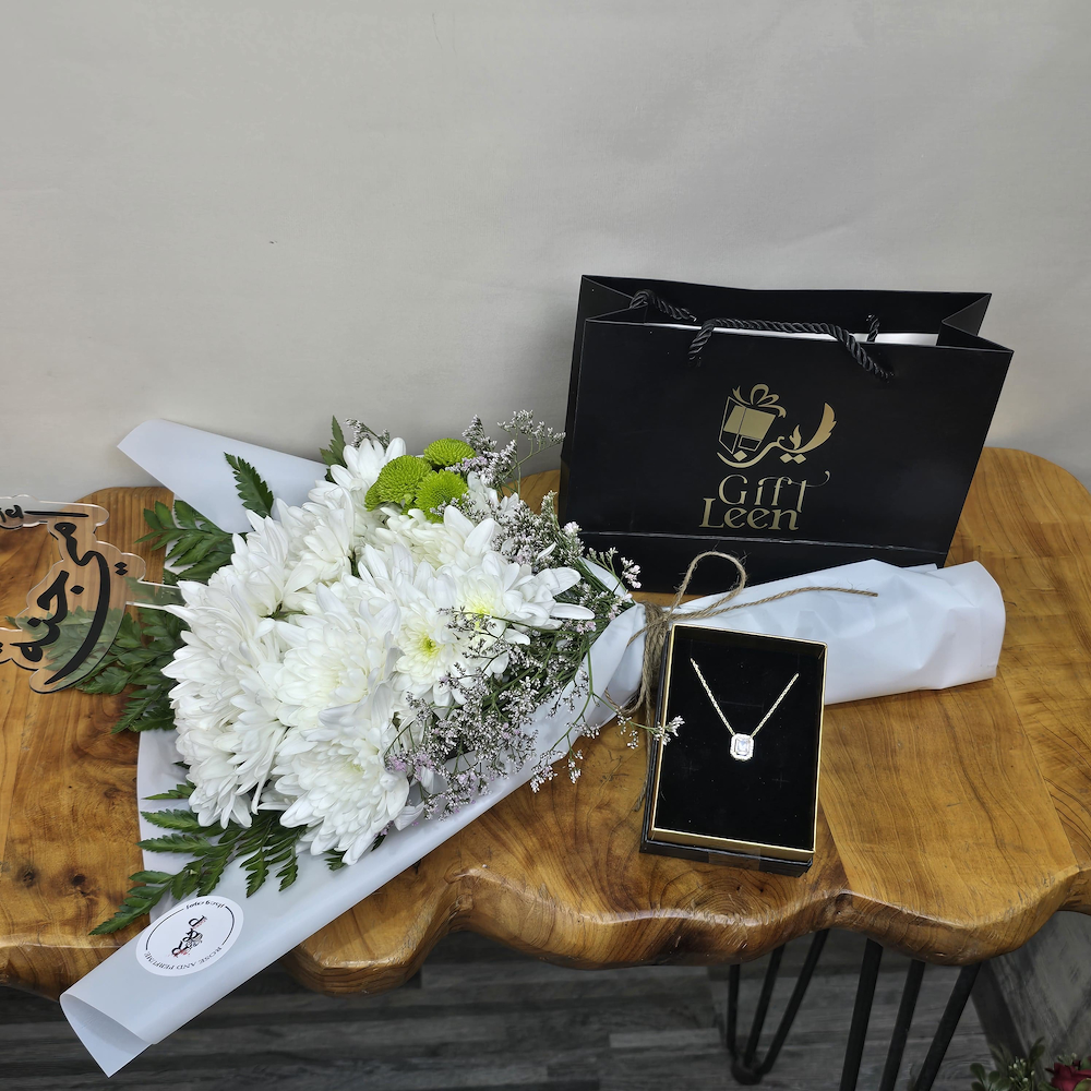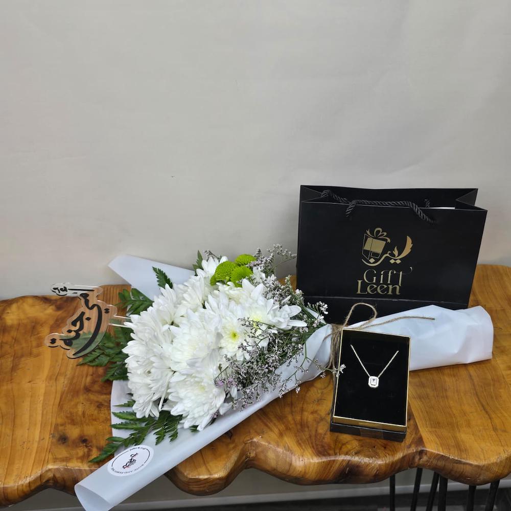 ‎باقه تحتوي علي أزهار الكريز مع قلادة زريكون.