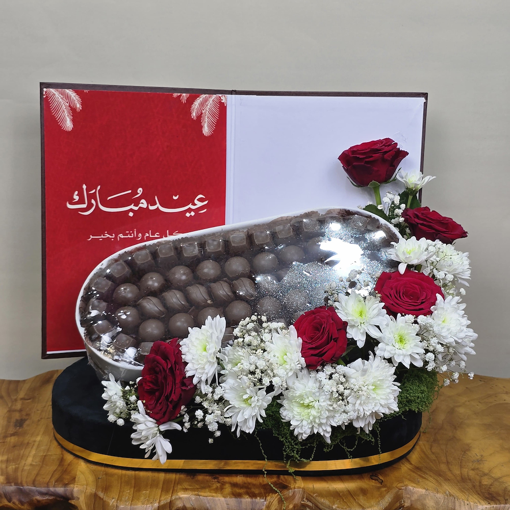 ستاند يحتوي على أزهار وورود ذات رائحة مميزة والشوكولاتة.