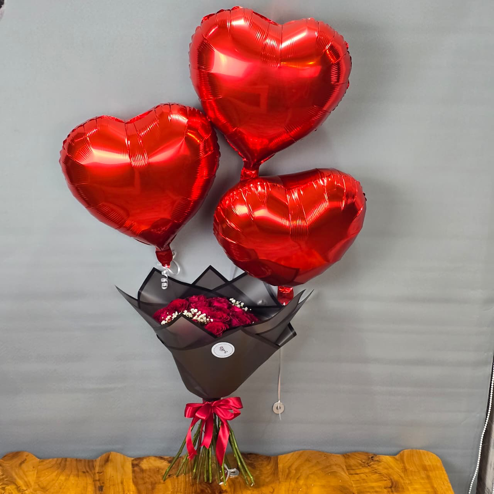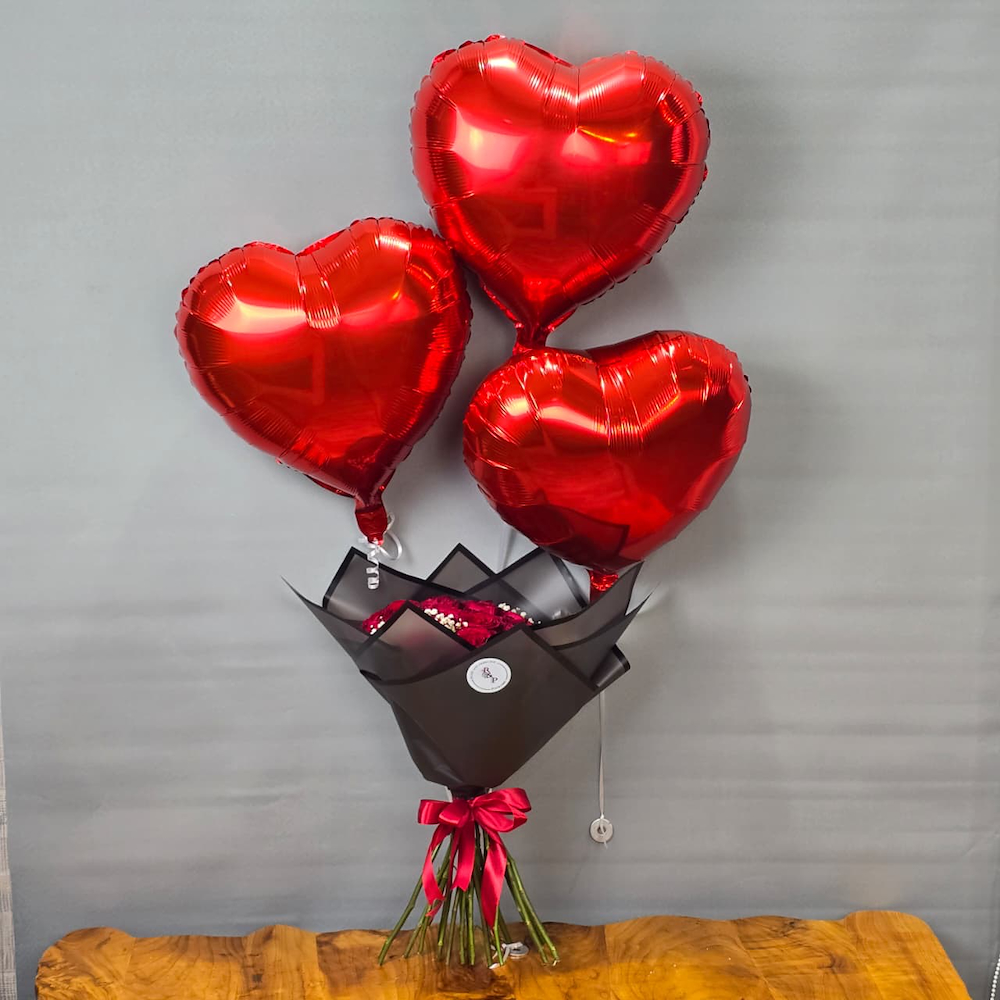 باقة تتميز بأزهار الجوري باللون الأحمر مع بالونات القلب.