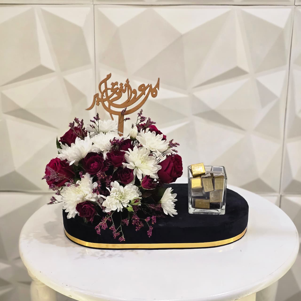 فازة مستديرة تحتوي على الجوري مع عطر لين.