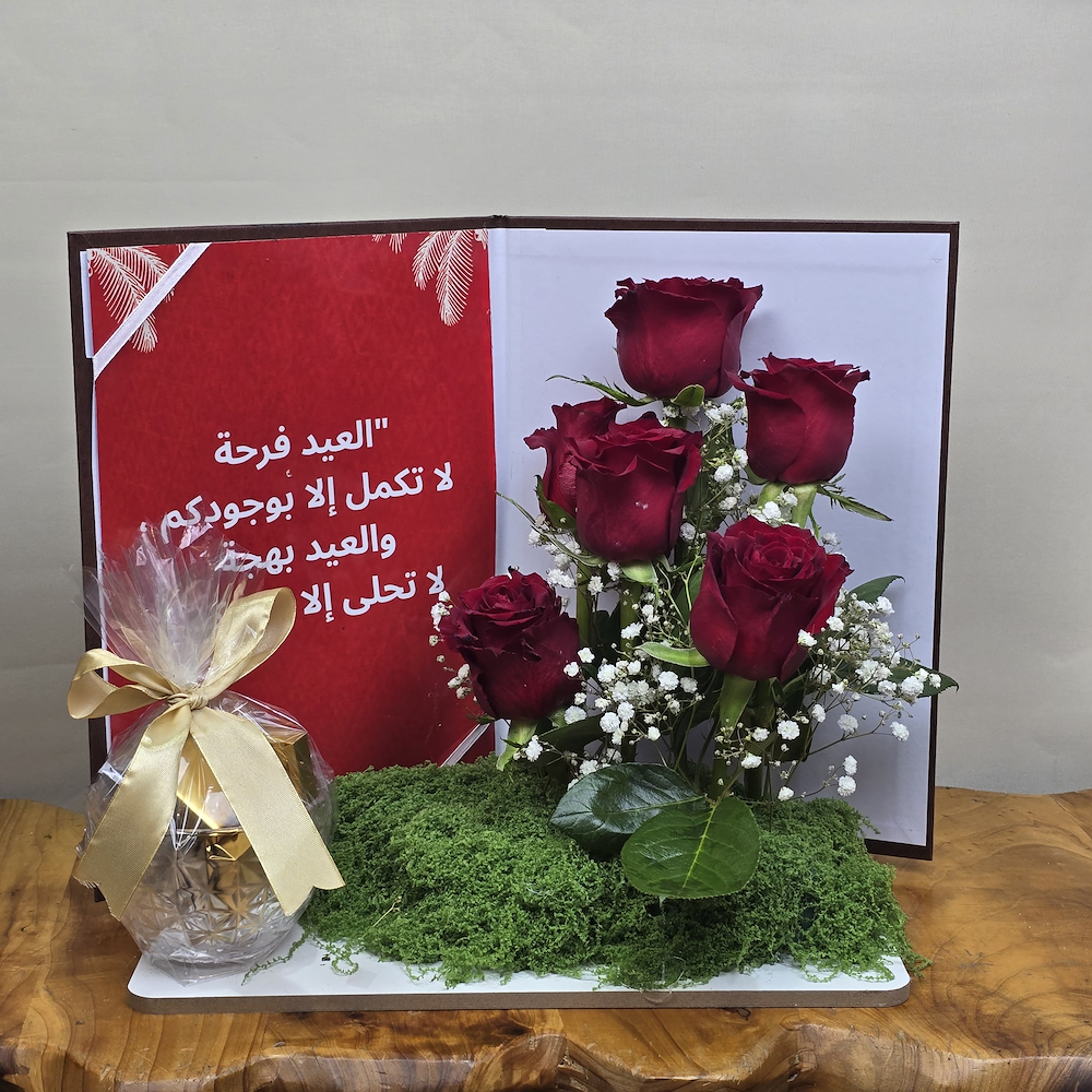 ستاند يحتوي على زهور الجوري مع الشوكولاتة.