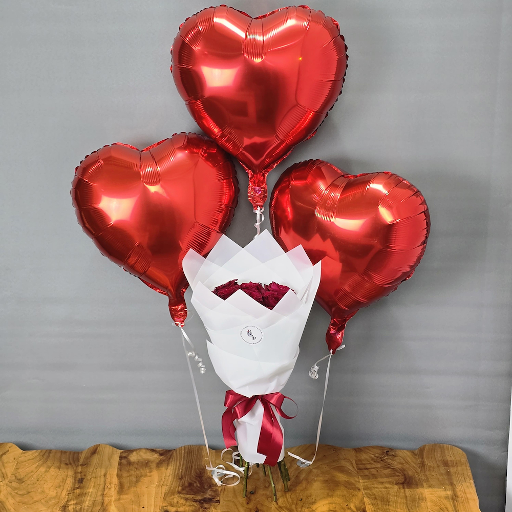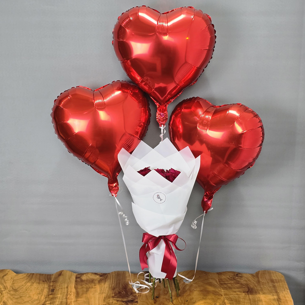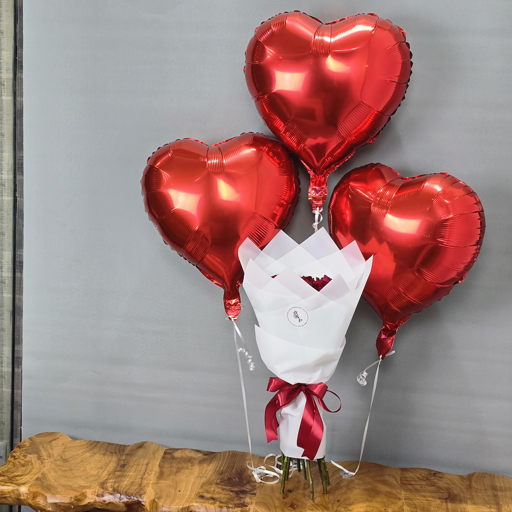 باقه تتميز بأزهار الجوري باللون الأحمر مع بالونات القلب.