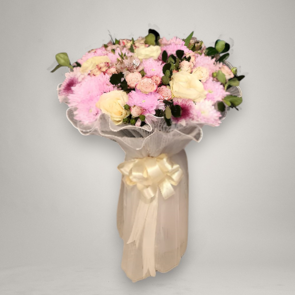 باقة أنيقة مليئة بأزهار الجوري، البيبي روز وأزهار الكريز الجميلة.