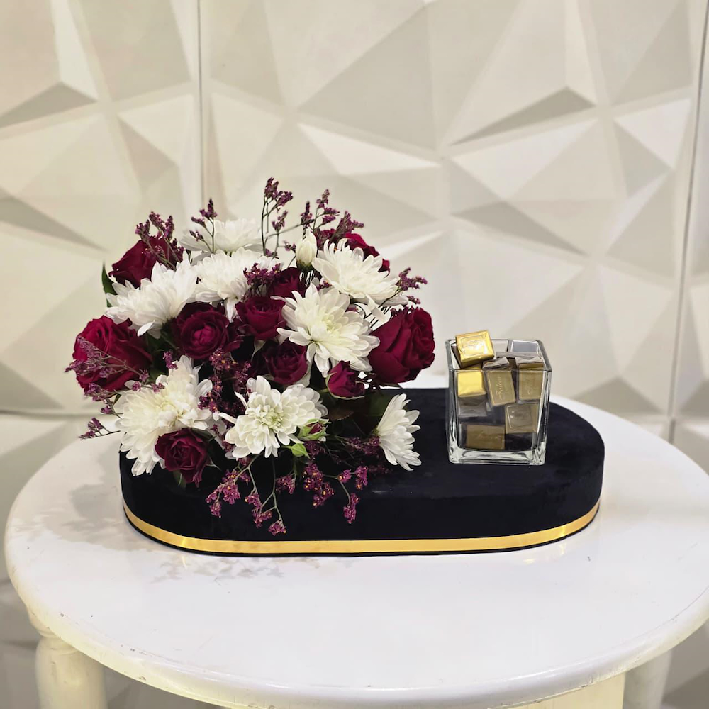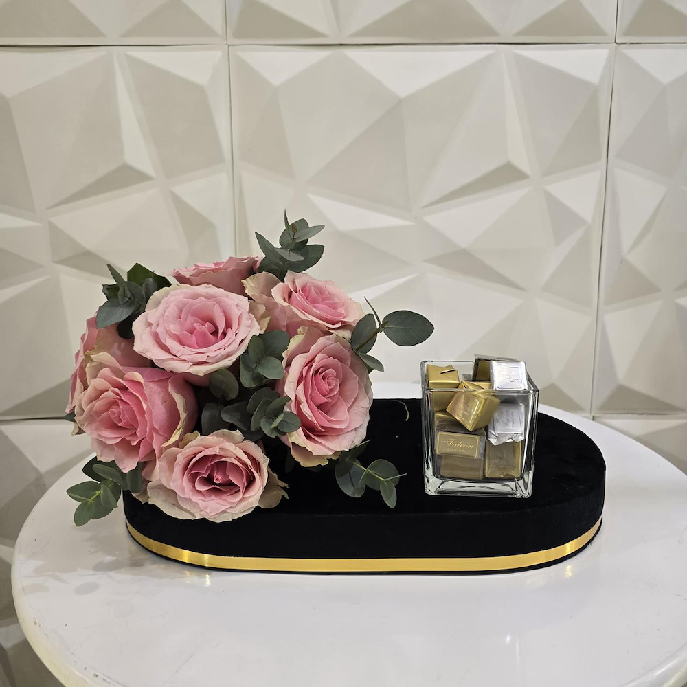 ستاند فاخر من المخمل يتميز بالورد الوردي الجوري مع شوكولاتة ليوم مميز لكم.