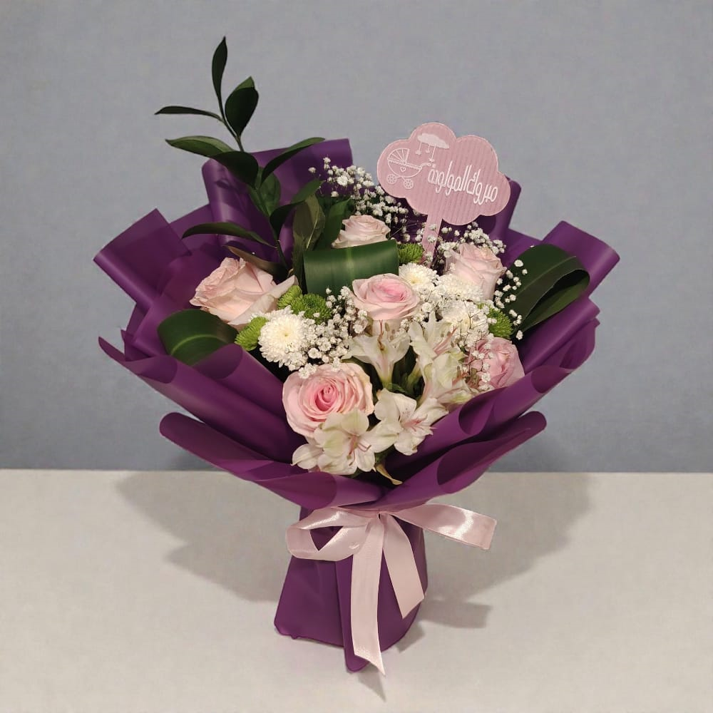 باقة تتميز بمزيج من ألوان الورود الهادئه حيث تمتزج بورد الجوري الوردي و الستروميريا و الجيبسوفيلا بينما تعطي جمال و أناقة.