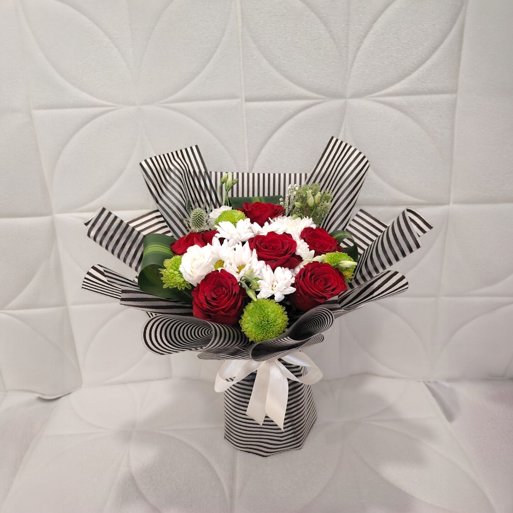 باقة تحتوي على الجوري، الكريز والاقحوان.