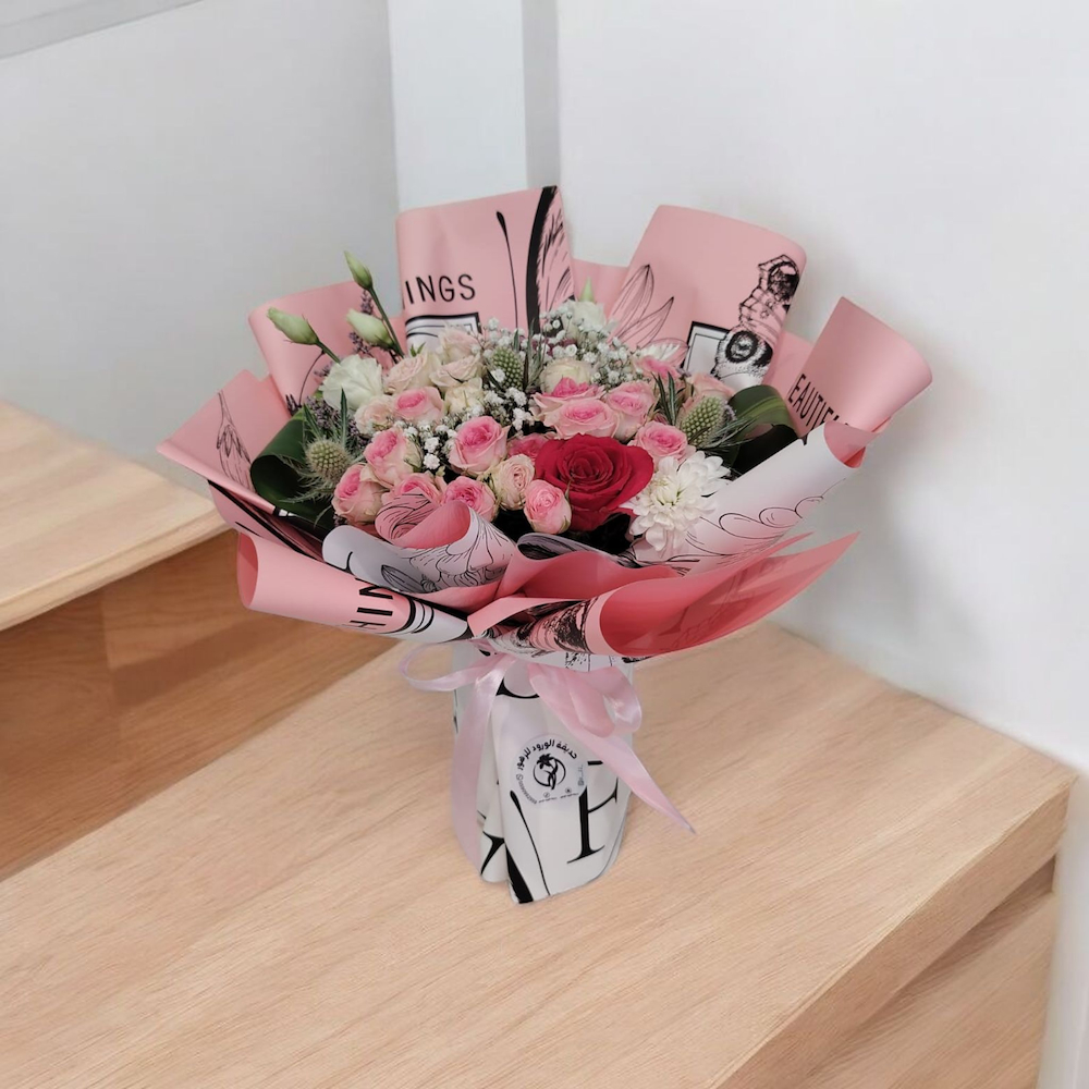 باقة يد تحتوي على الجوري، البيبي جوري، الكريز والجيبسوفيلا.