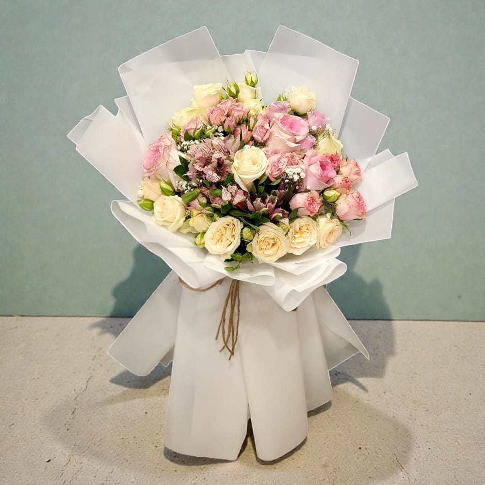 باقة ترمز إلى اللطف و النعومه بينما تعكس ورود الجوري و ورد البيبي روز و ورد الستروميريا حيث تعطي النقاء و البراءة.