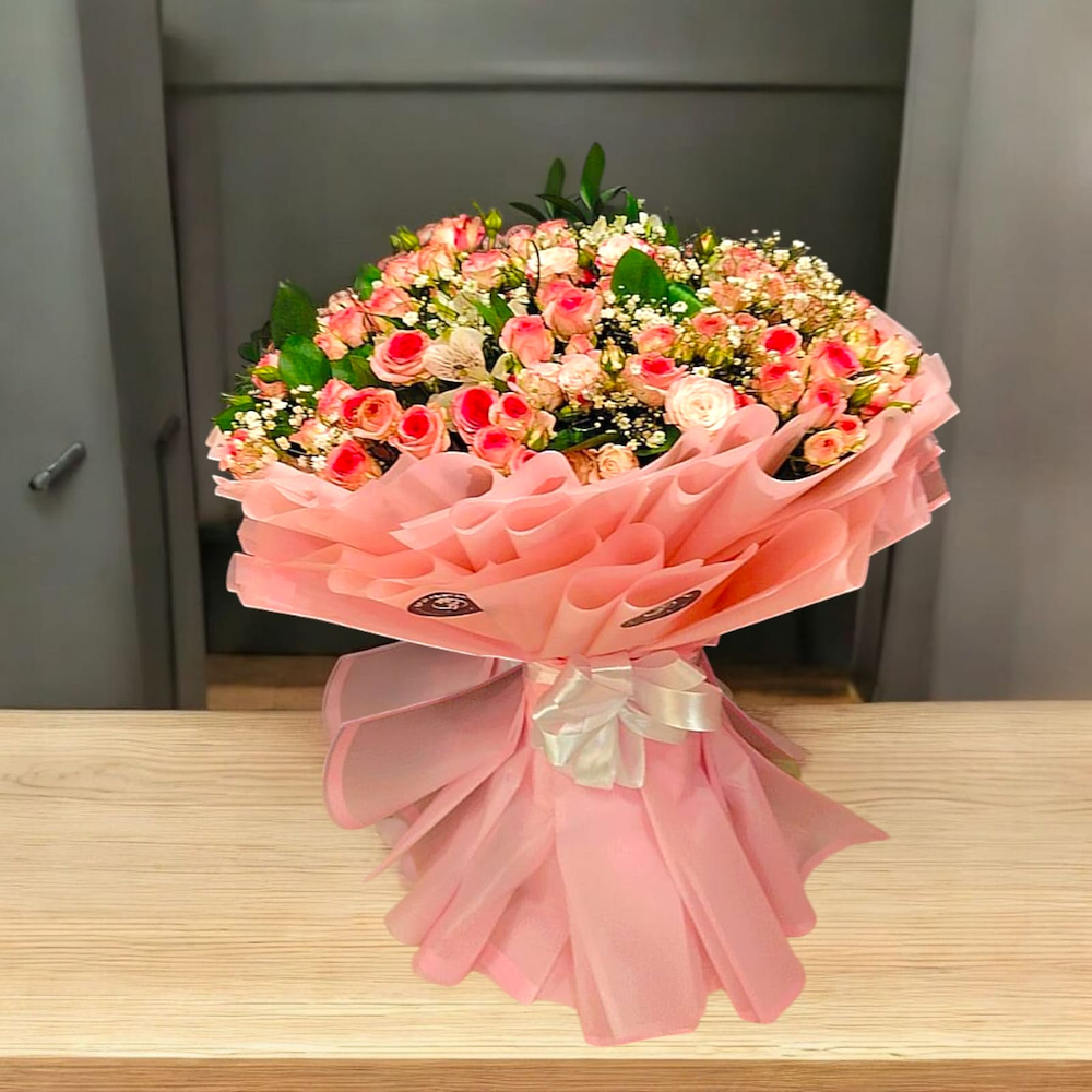باقة يد تحتوي على الجوري، الجيبسوفيلا والالستروميريا.