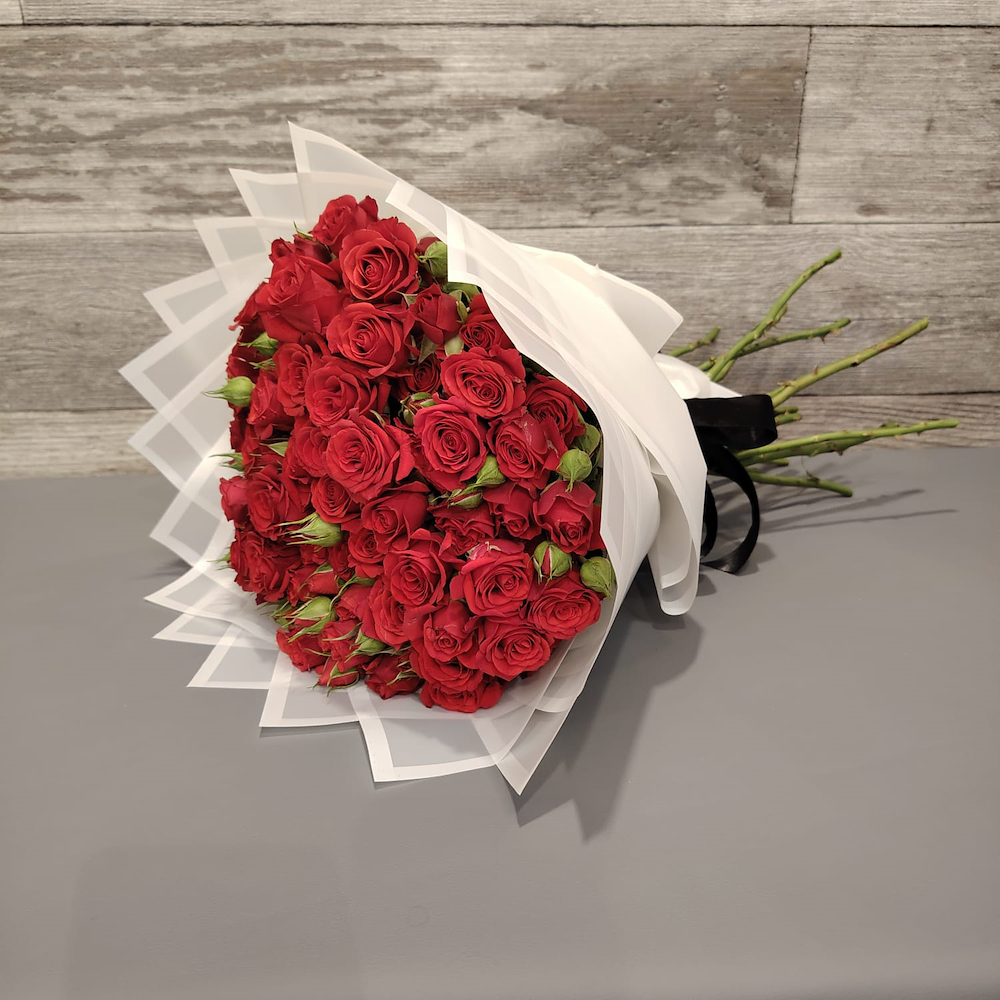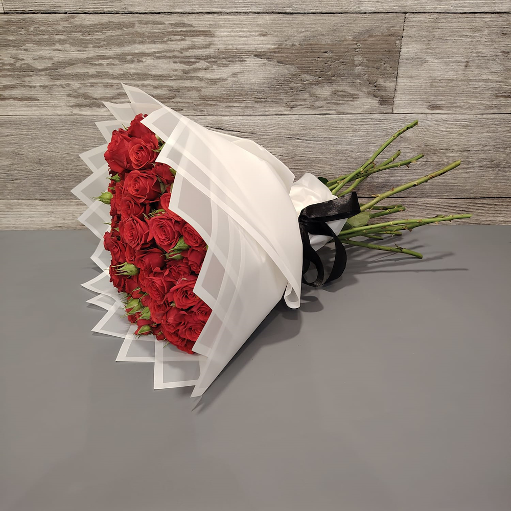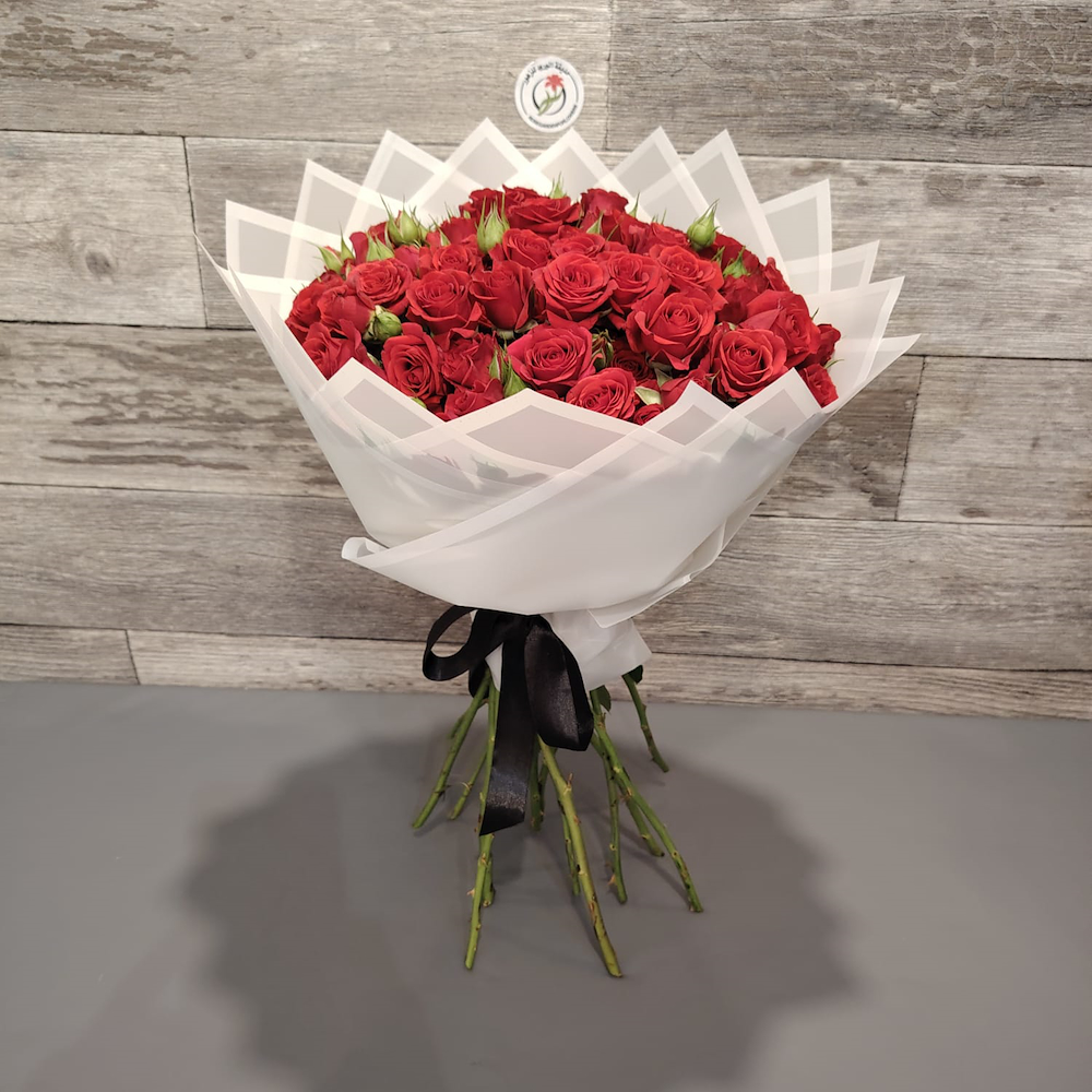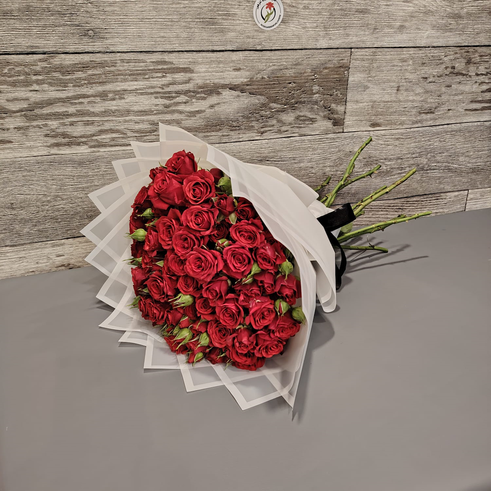 ورد بيبي روز أحمر بتغليف أبيض ناعم مما يعطيه أناقة وفخامة.