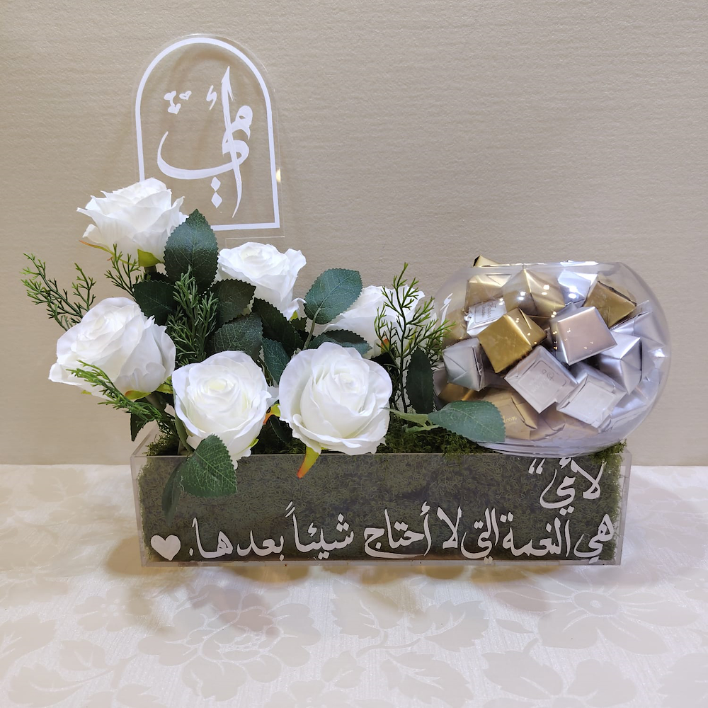 بوكس أكريليك مليئ بأزهار الجوري البيضاء مع تغريسة وجار من الشوكولاتة المغلفة الفاخرة.