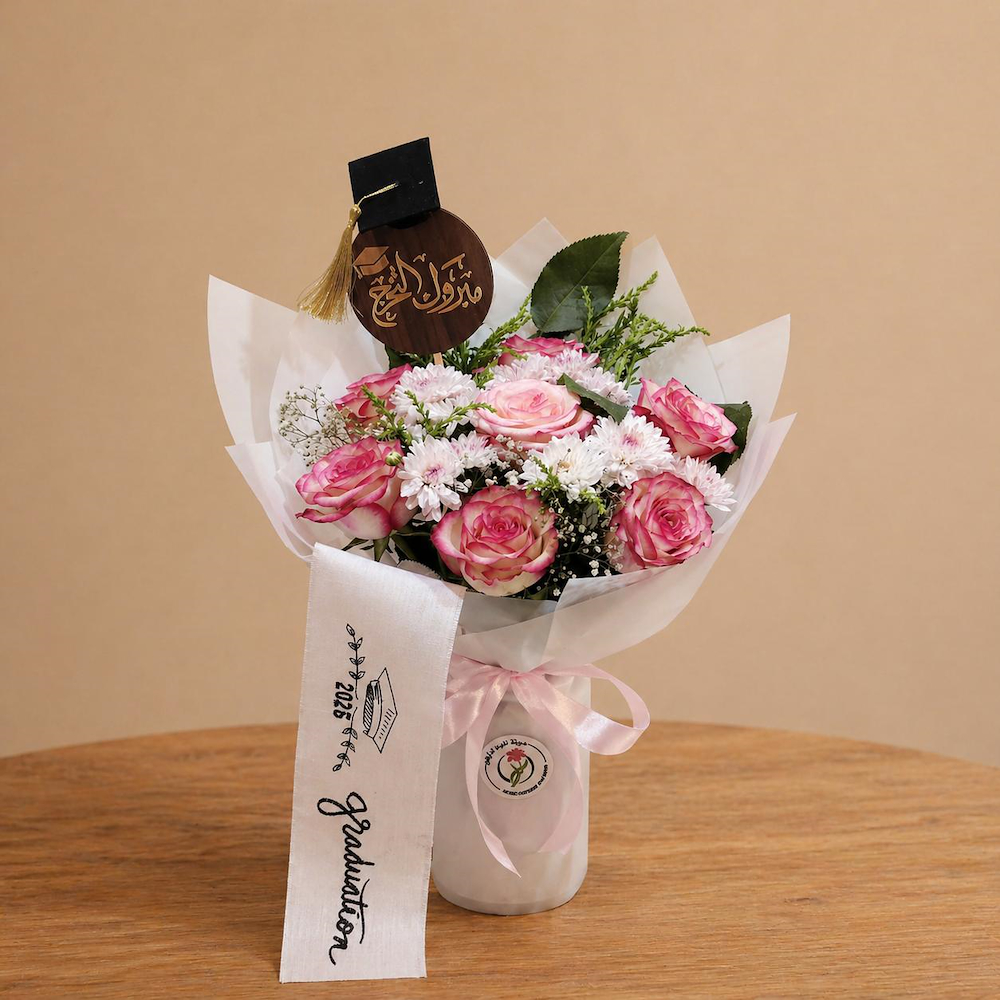 باقة يد تحتوي على الجوري، الكريز والجيبسوفيلا مع تغريسة التخرج.