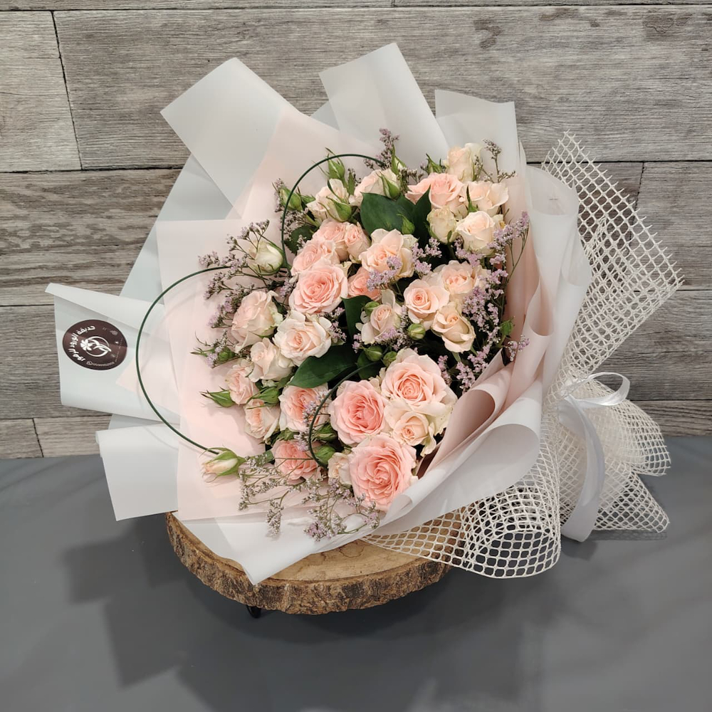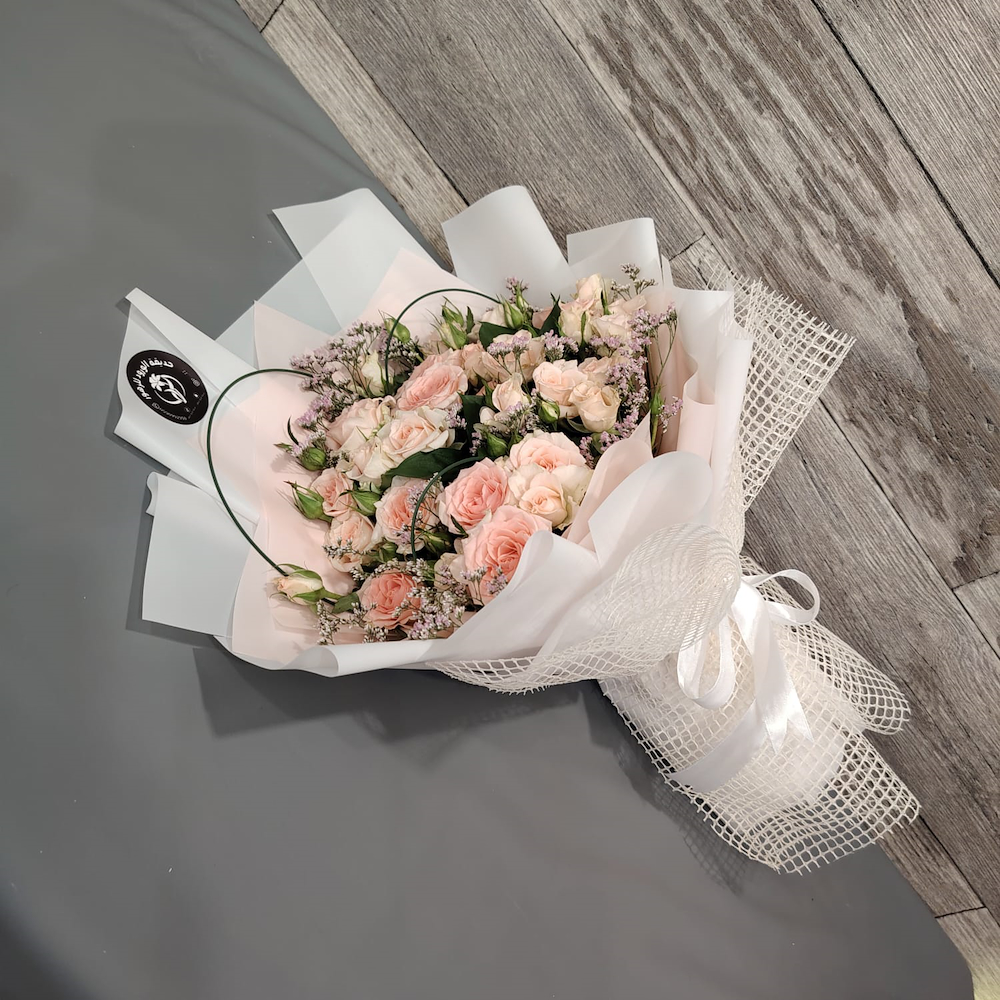 باقة من زهور البيبي جوري الوردية مع أغصان خضراء و هور بنفسجية صغيرة بتنسيق راقي و تغليف جذاب.